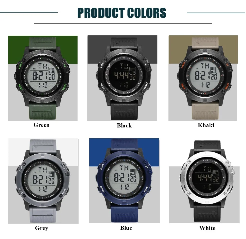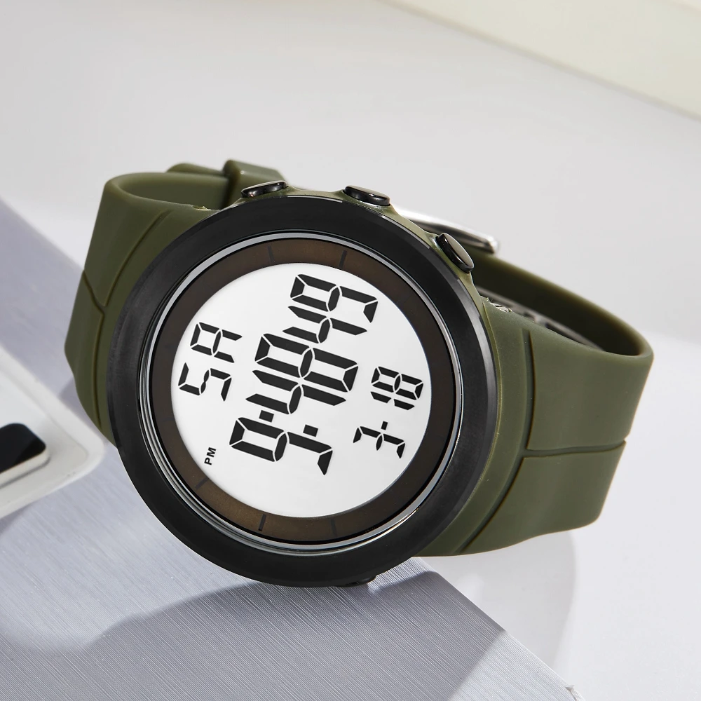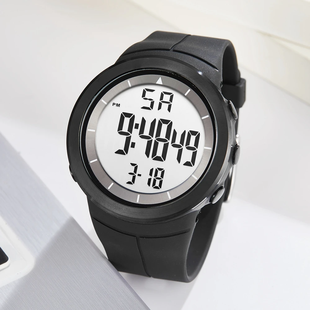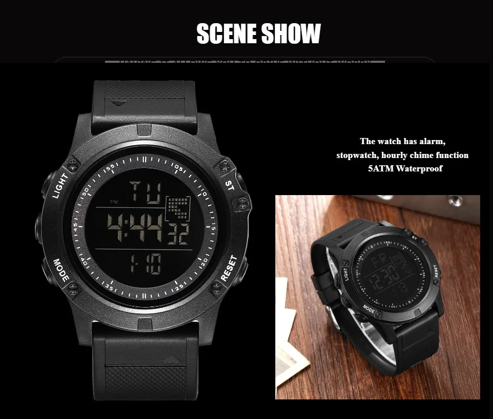 Цифровой: часы, минуты, секунды, pm, месяц, дата, день12/24 формата отображения времениФункция будильника и ежечасного звонкаСпециальный дизайн с хронографом (секундомером) с шагом 0,01 секундВодонепроницаемость до 30 м (не нажимайте кнопки в воде)Дополнительная функция подсветки ЖК-дисплея для четкого отображения времени в темнотеУдаропрочность, подходит как для наружных видов спорта, так и для внутренних видов спорта