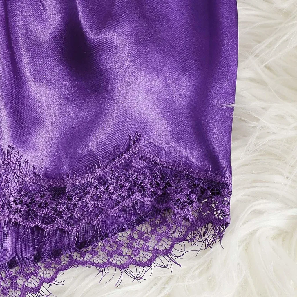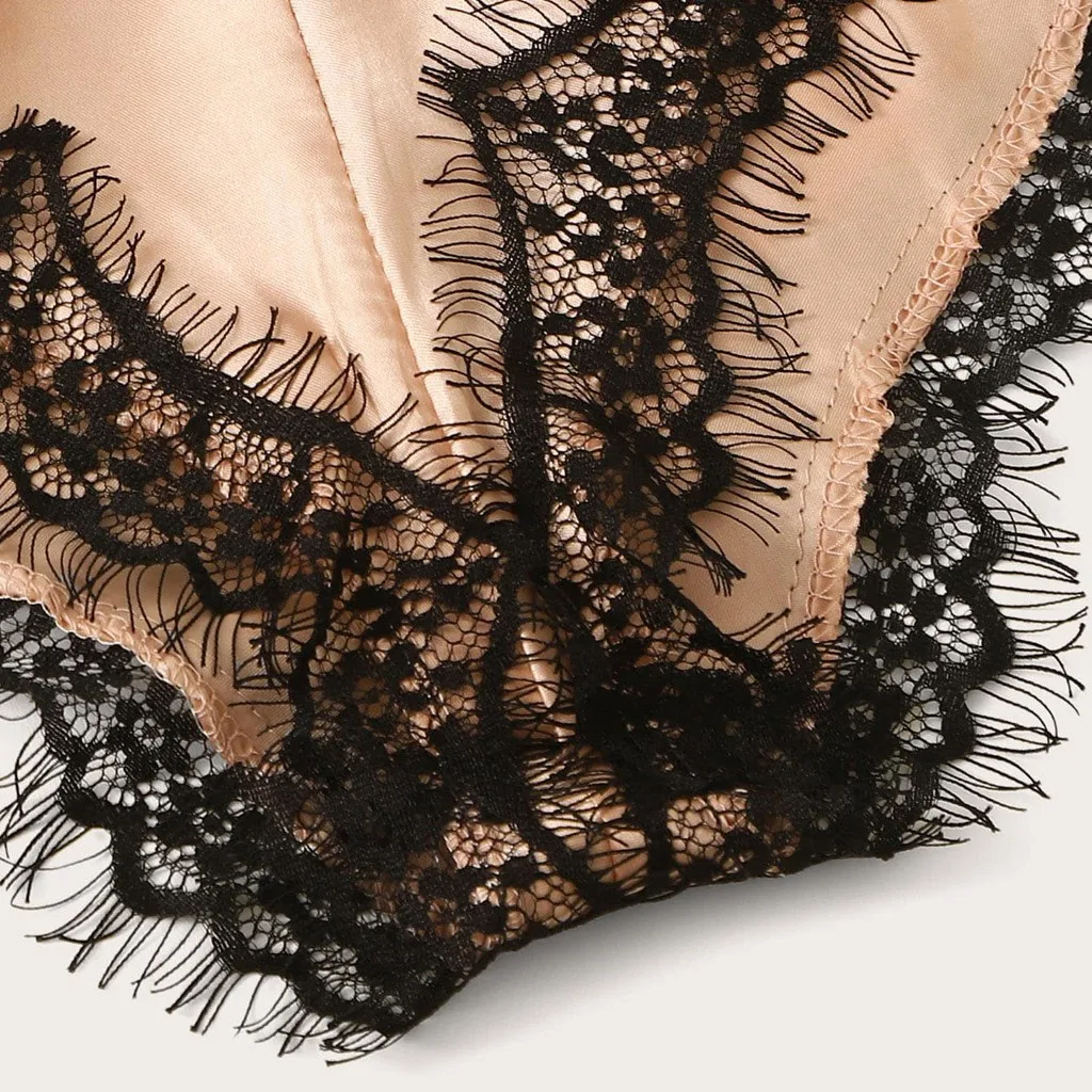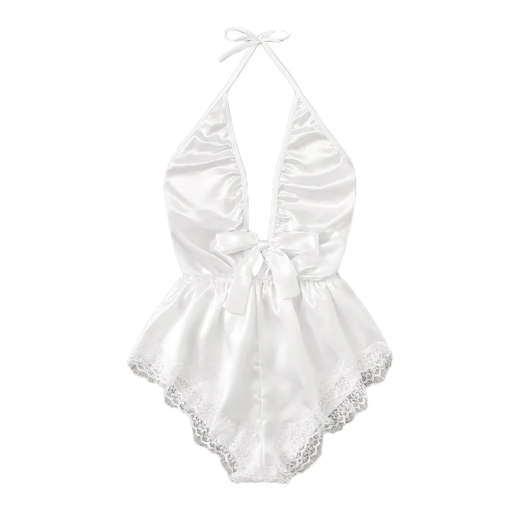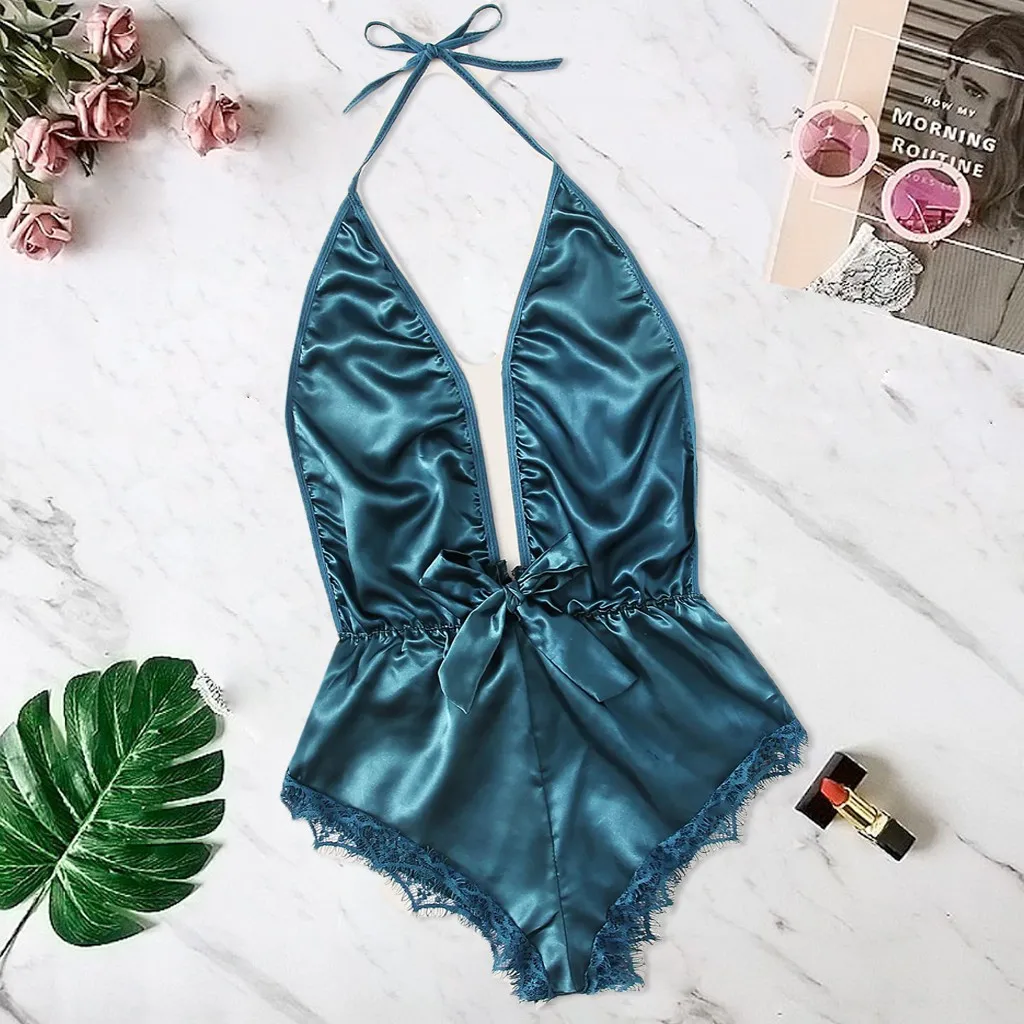 Сексуальное женское белье, атласная ночная сорочка, Тедди, глубокий v-образный вырез, кружевной бант, Холтер, открытая спина, пижамы, нижнее белье, костюмы лэнгри