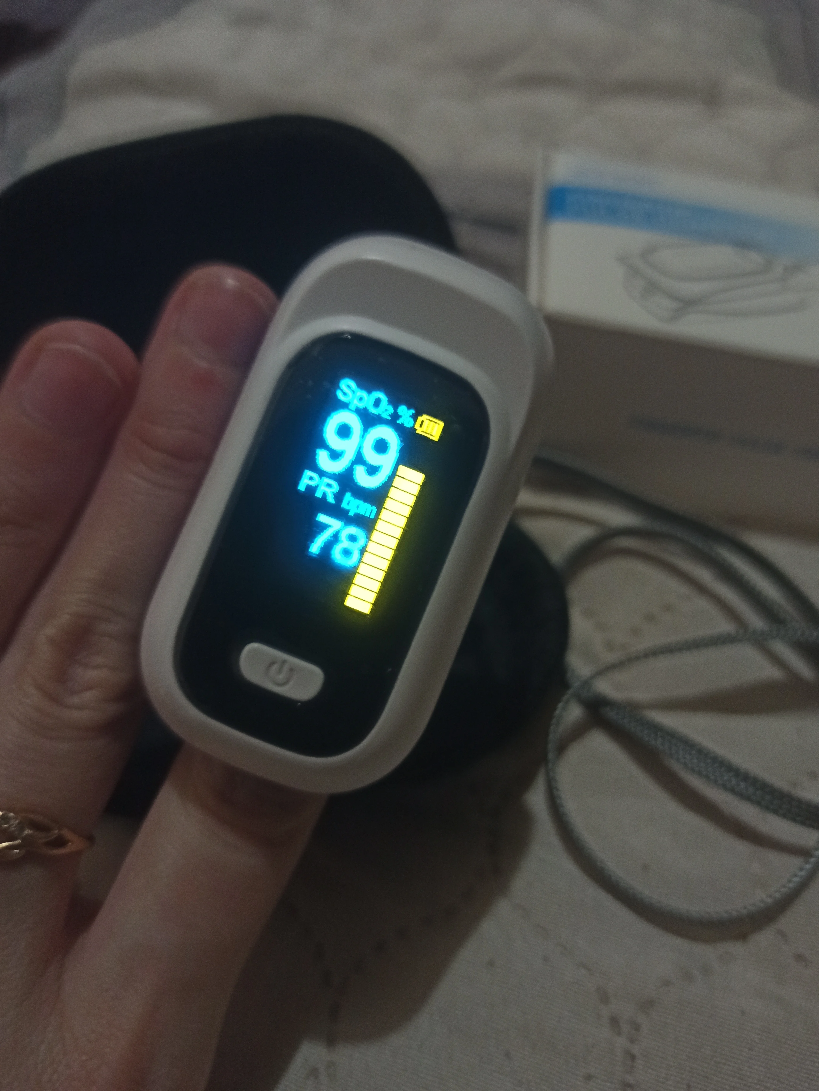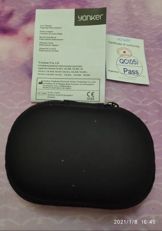 Посылка доставлена менее, чем за 10 дней. Упакована хорошо, в надувной "матрас", так что коробка пришла в целости и сохранности. Пульсоксиметр был сразу в чехле вложен в коробку, внутри ещё лежит инструкция на нескольких языках(русского нет, зато есть английский), верёвочка для подвешивания, какой-то сертификат. Дисплей поворачивается, есть настройки уведомления о критичных показателях - будет пищать. Работает от 2 батареек формата ААА, в комплекте их нет. Автоматически отключается через несколько секунд после завершения измерения. А по точности посмотрим, как он себя покажет в практике, сомневаюсь, что будет большая погрешность.