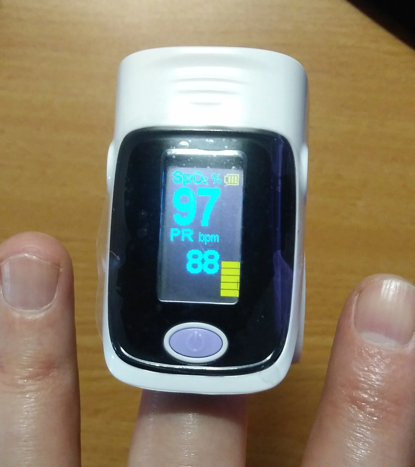 Отлично работает. Показания имеют некоторые задержки. Я прекратил дыхание, чтобы проверить его. Мне нужно подождать 40 секунд, прежде чем отображаемый уровень кислорода начнет быстро уменьшаться до 90 градусов.