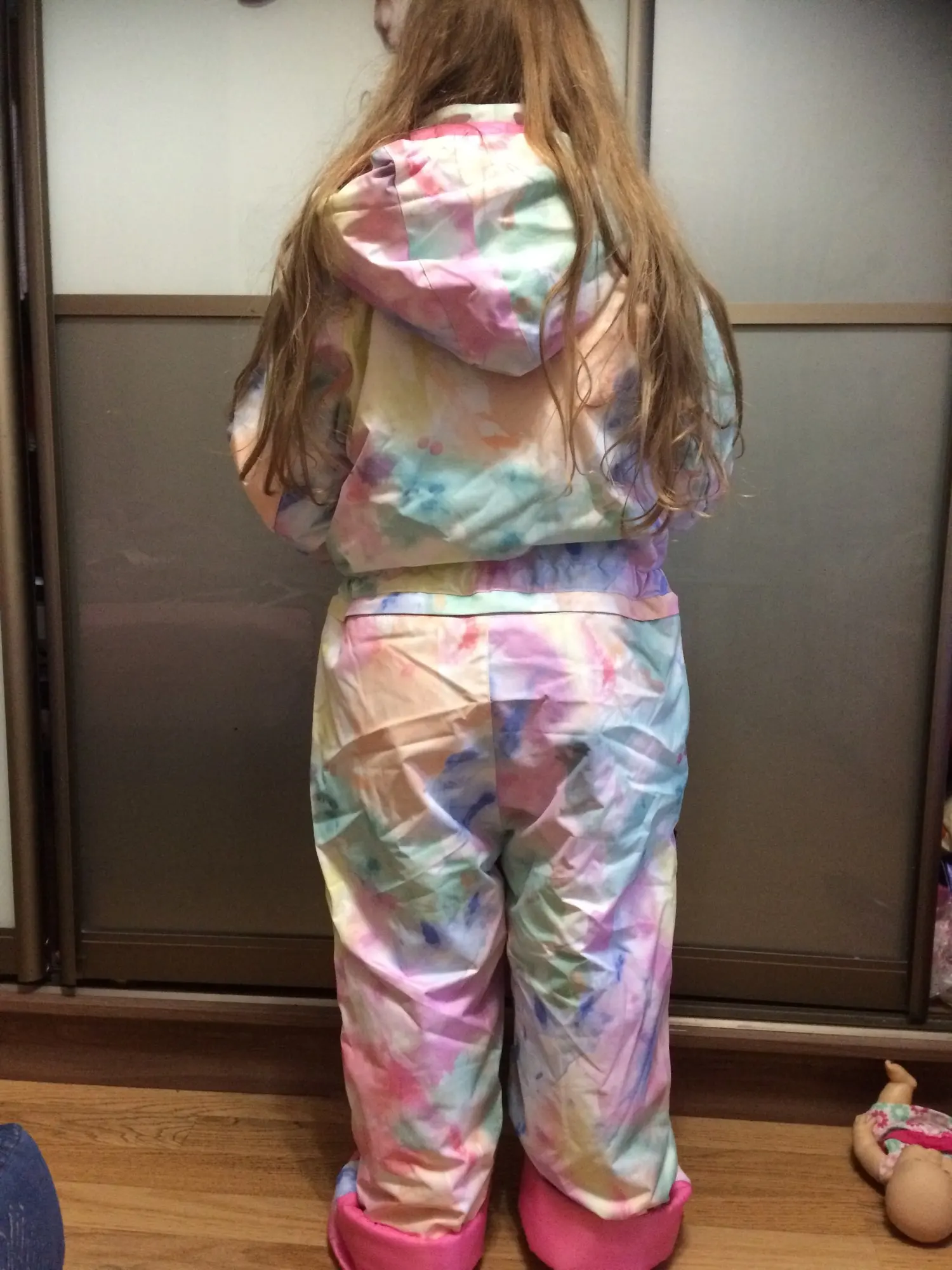 Отличный комбез. Яркий, качество отличное, ниток нет, запаха нет, молнии хорошие. Комбез идет в размер, взяли 160 рост, на размер 145, большой, 10см запас по штанам. ну и по полноте есть запас. Отличный выбор, смело можно брать. До Москвы 3 недели.