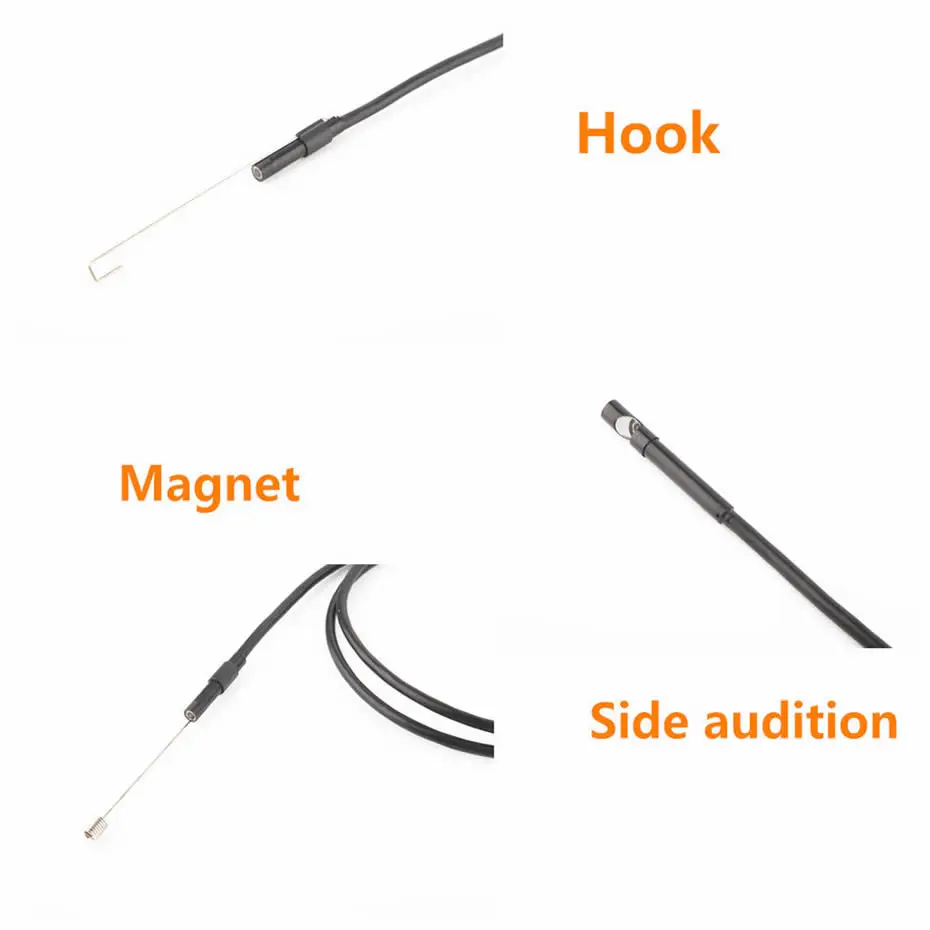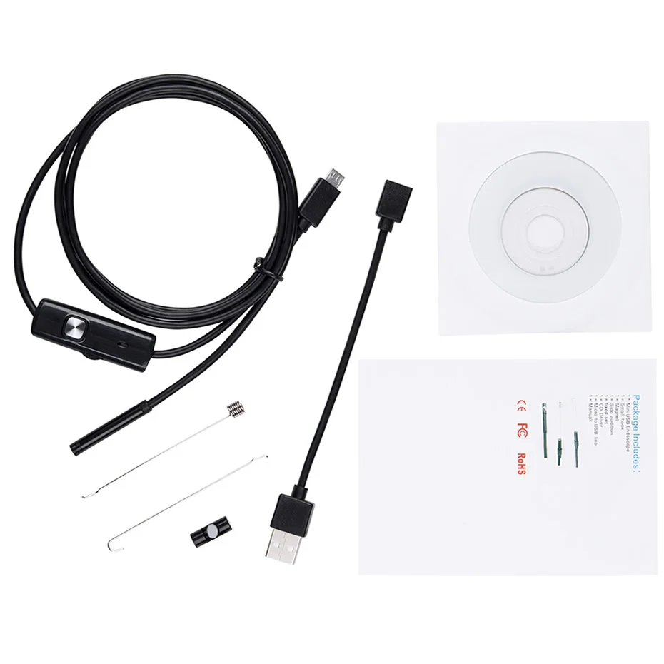 Эндоскоп x1Маленький крючок x1Магнит x1Боковое зеркало x1Разъем USB x1CD x1Руководство пользователя x1Кольцо объектива x1