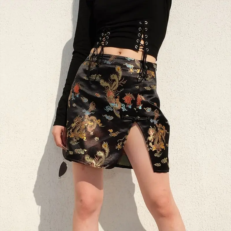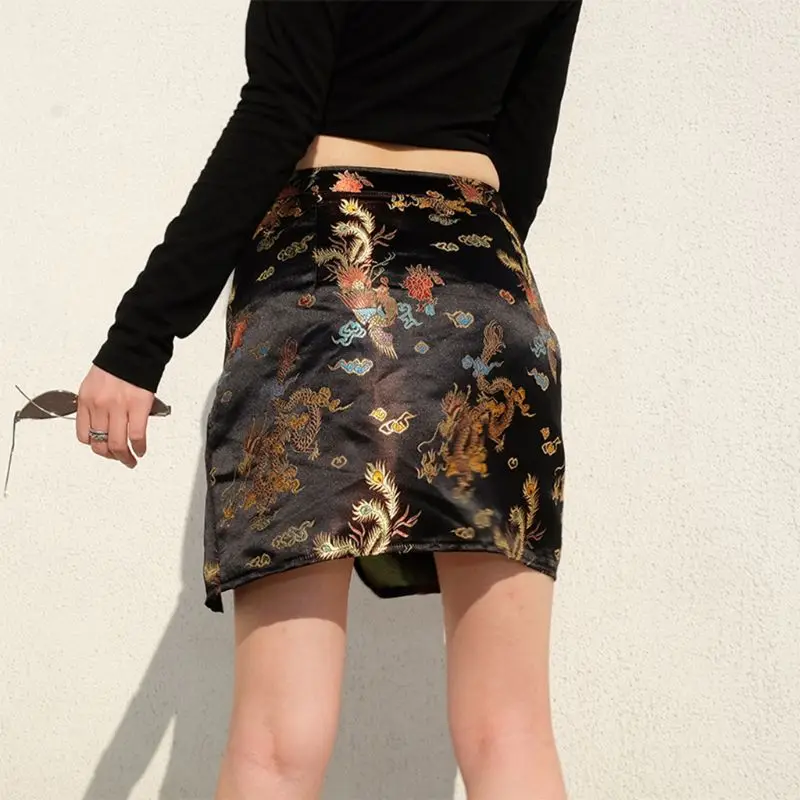 Короткая облегающая мини-юбка в китайском стиле с принтом дракона, ...