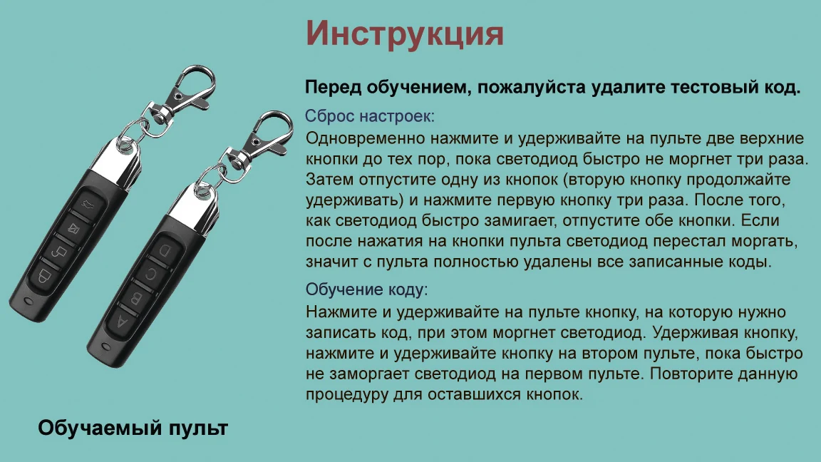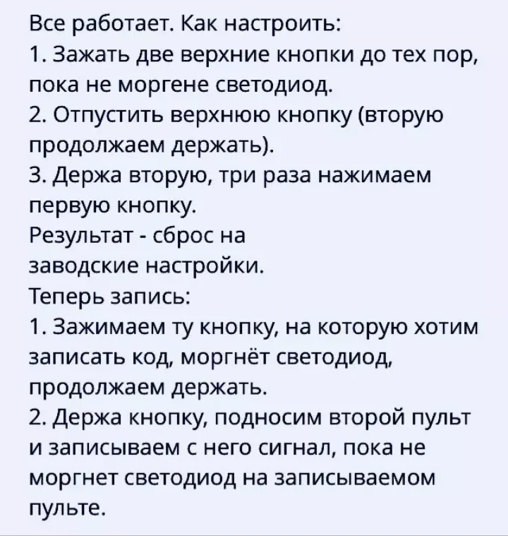 приложенная инструкция неправильная - см. второе фото. при копировании держа родной пульт подносим к нему новый пульт, на родном пульте нажимаем кнопку открытия ворот и держим её, потом нажимаем кнопку на новом пульте - должен моргнуть светодиод, продолжаем держать пока светодиод не загорится постоянно. всё брелок готов к работе.