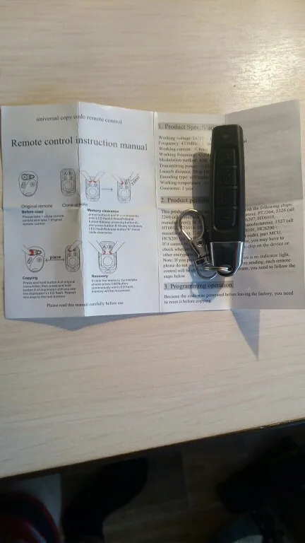 Брелок прилетел с заряженной батарейкой, пробовал продублировать сигнал пульта от люстры, не получилось, возможно работают на разных частотах! Буду пробовать еще с одним девайсом. Вместе с брелоком идет инструкция на английском языке, простенькая.