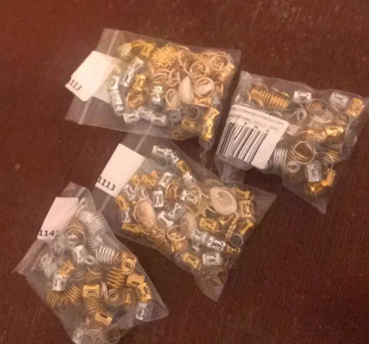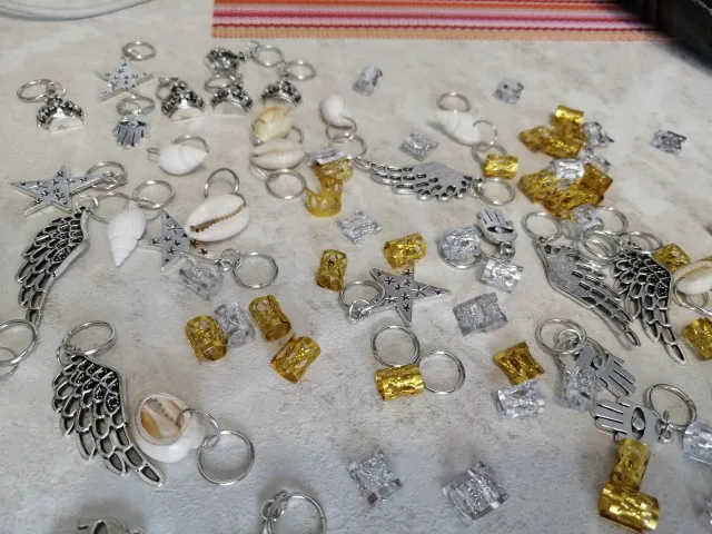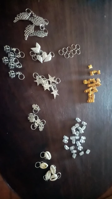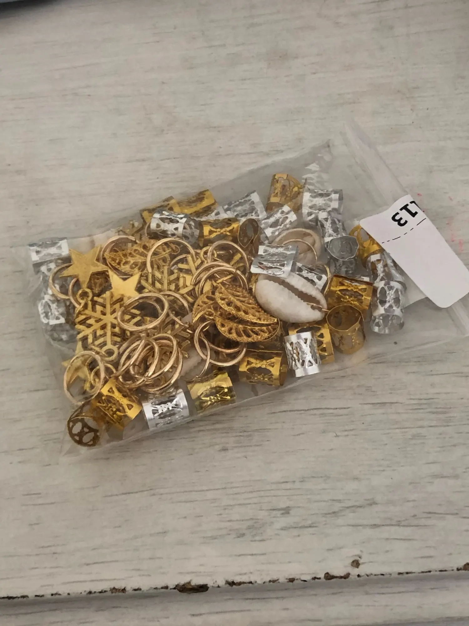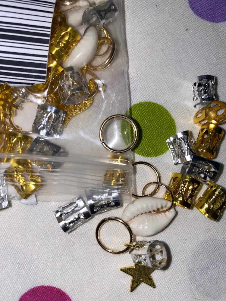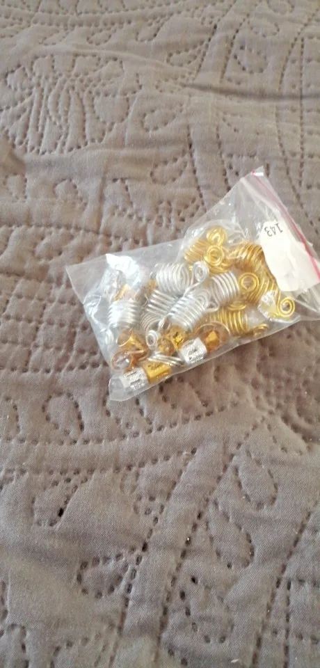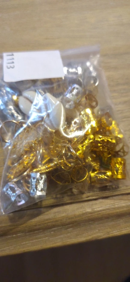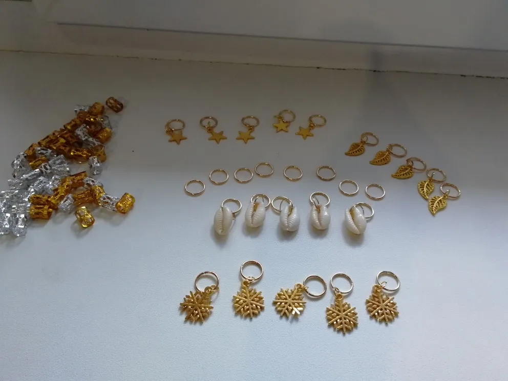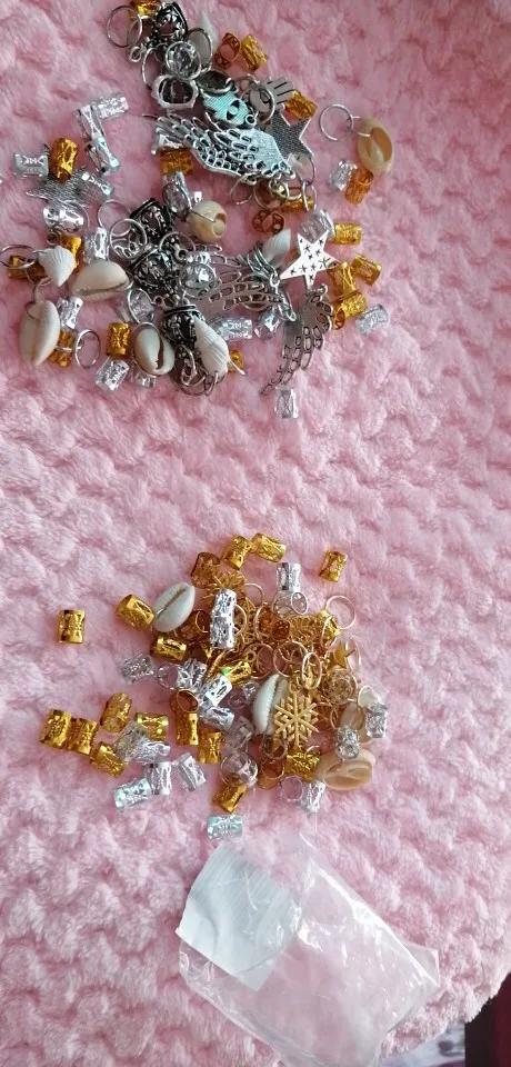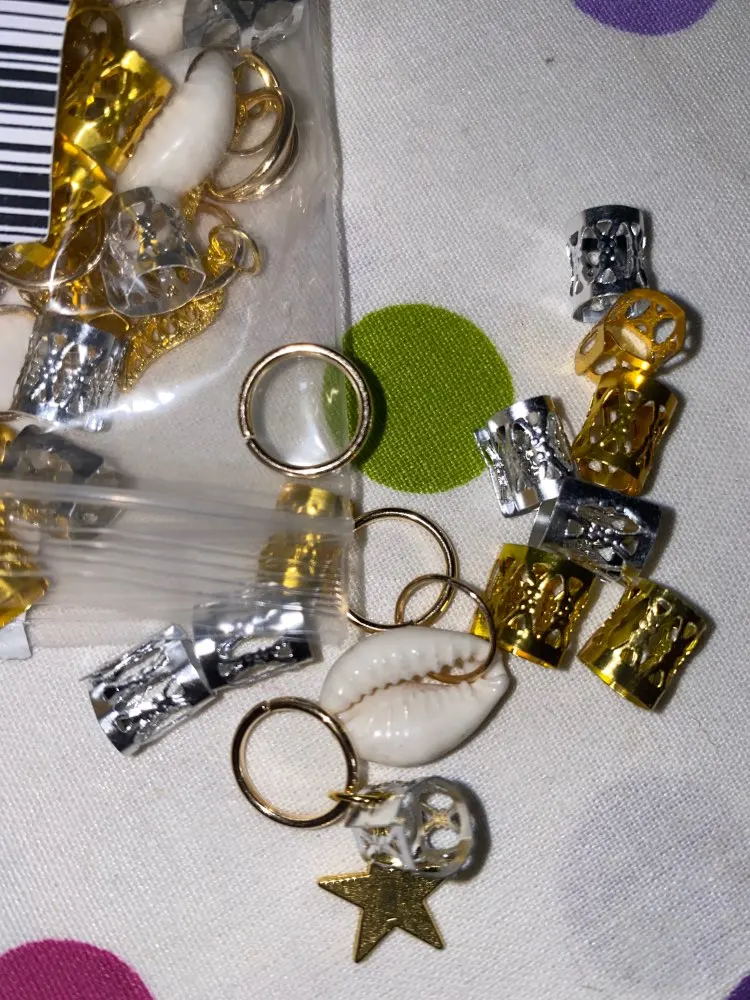 Цилиндрики золотые и серебряные из осень мягкого металла, как фольга, пришли все помятые. Использовать не возможно, на выброс!! Остальные украшения хорошие, но цеплять их на волосы не удобно, кольца наоборот очень жёсткие, тяжело открываются.