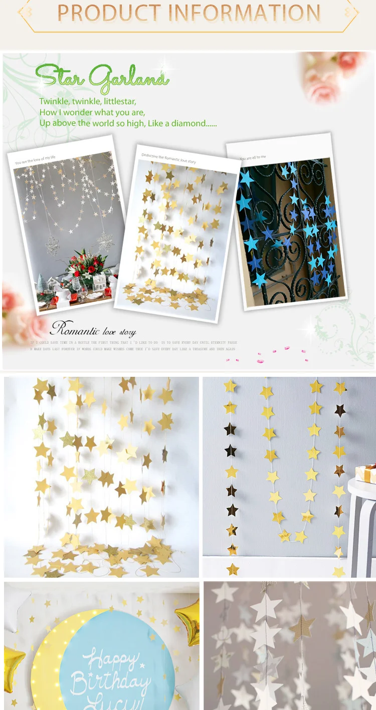 Товар: 4 м длинный блестящий цветокДлинная цепочка для свадьбы, дня рожденияЦвет: золотой, синий, серебряный, небесно-голубойДлина примерно: 4 метра,Размер звезды: 10 смМатериал: двухсторонний Высокое качество картонИспользование: предметы домашнего обихода, школьные классы, свадебные комнаты, декор магазина, свадьбы, вечеринки, фестивали и т. Д.Примечание: Из-за ручного производства размер будет немного отличаться.