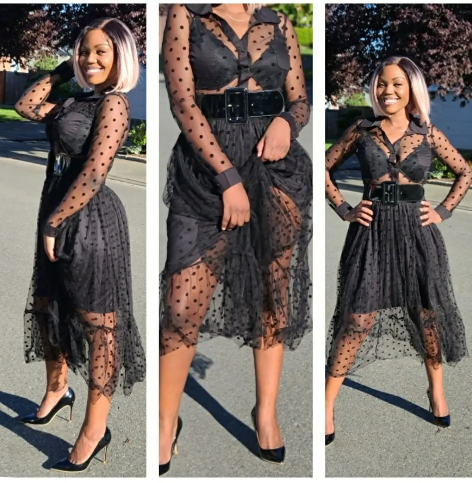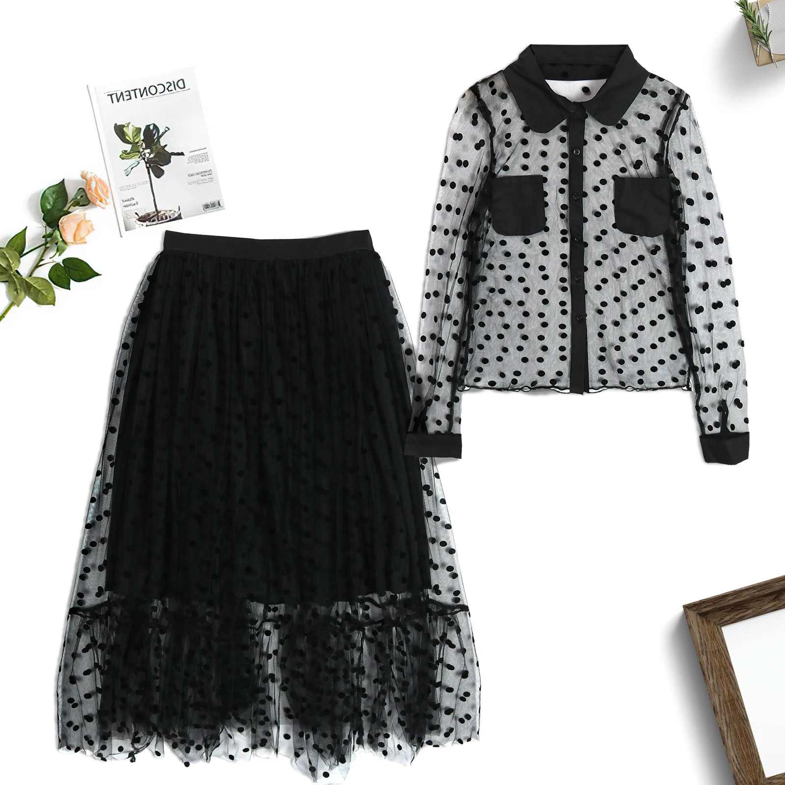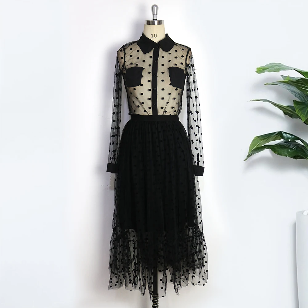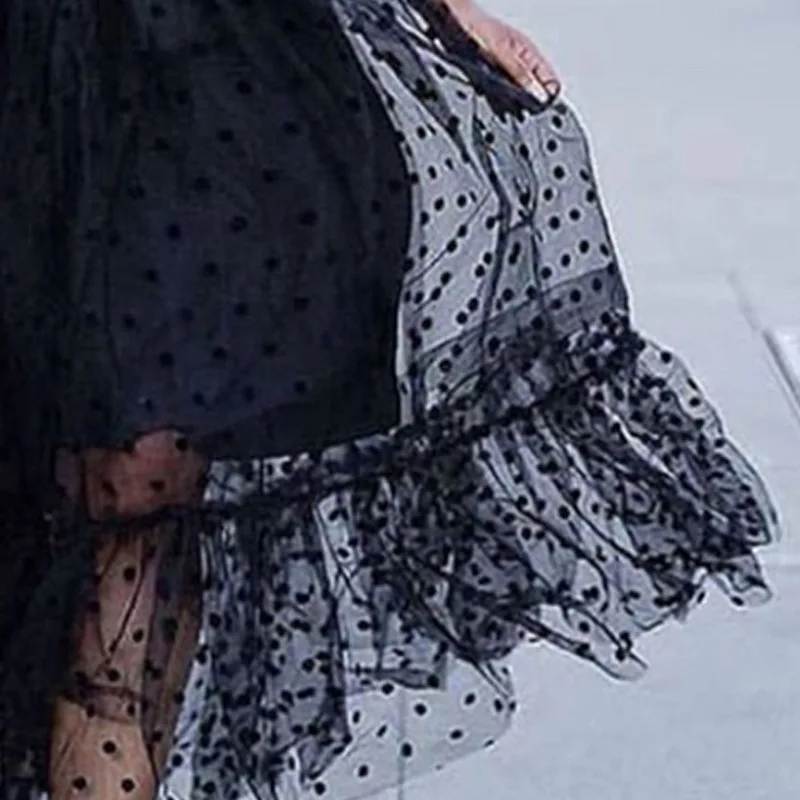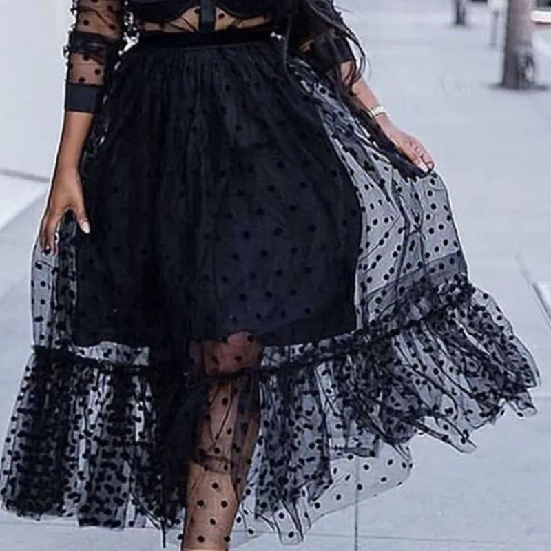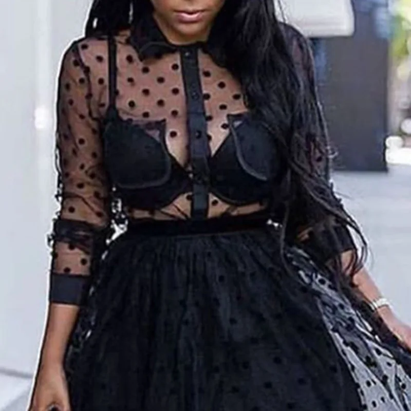 Женский сетчатый костюм, комплект из двух предметов, прозрачный топ в горошек, юбка из тюля с подкладкой и эластичной талией, прозрачные майки