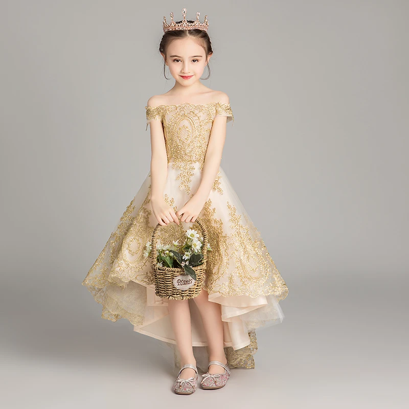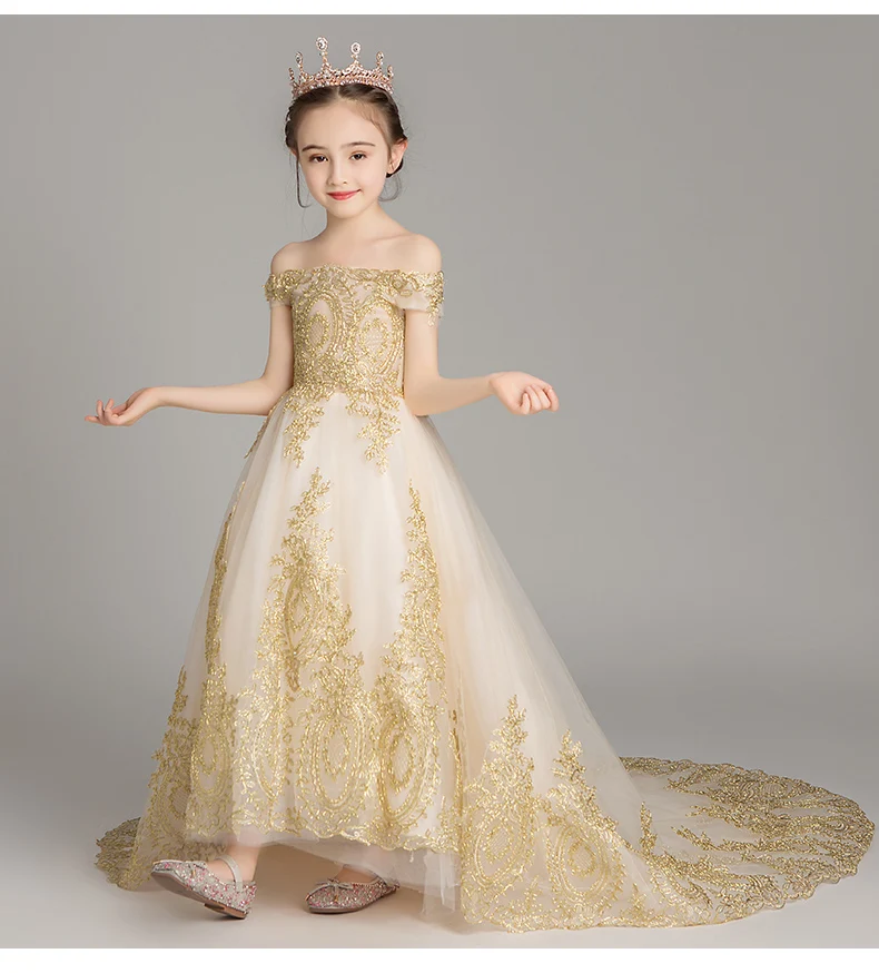 Свадебное платье с открытыми плечами для девочек, платье принцессы из тюля с золотыми блестками и цветочным узором для девочек, детское праздничное платье для причастия