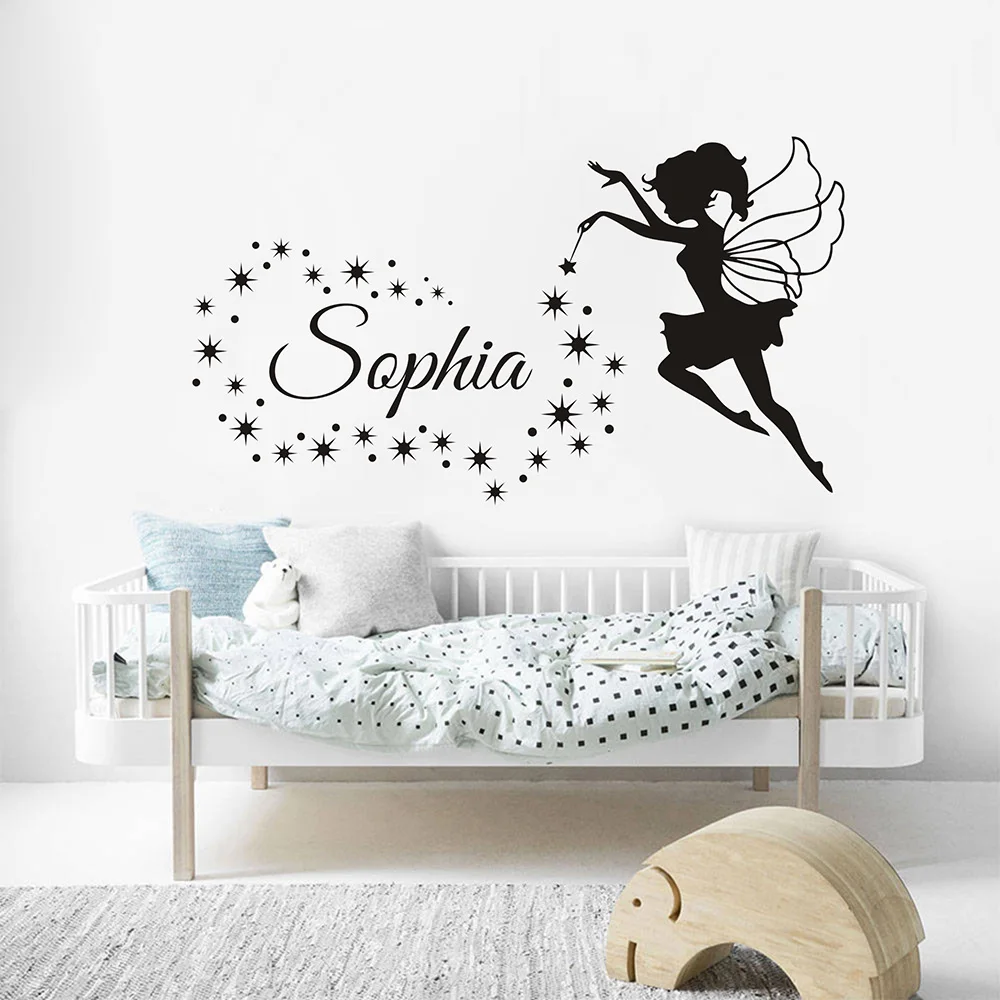 Пользовательское имя Феи Ангел звезды Наклейка на стену персонализированные питомник Babys имя Винил Съемный стикер дети спальня украшения B310