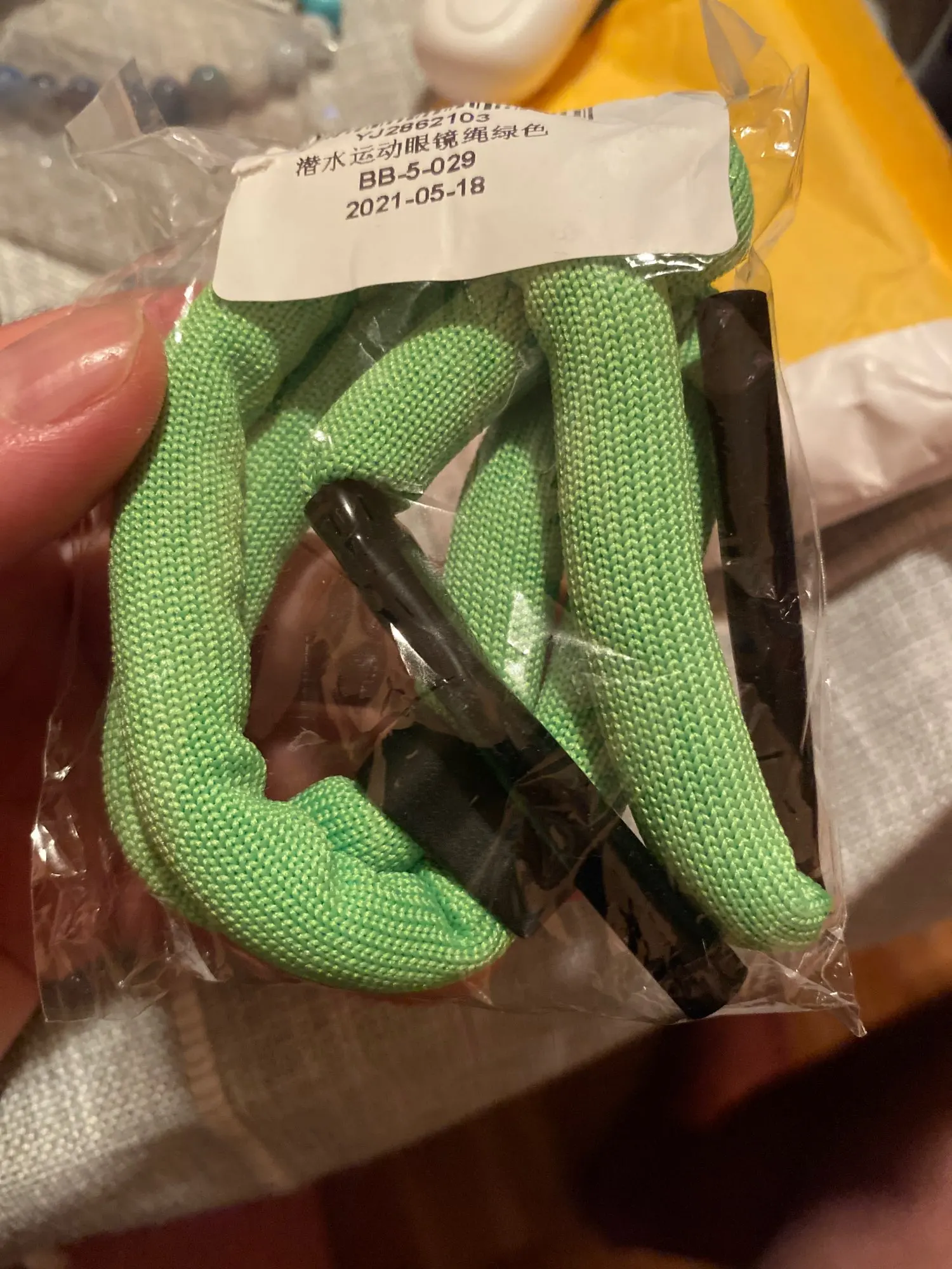 Посылка добиралась до места вручения 21 день, на 3-й день ее объединили еще с четырьмя посылками и перенаправили ее в пункт выдачи заказов. Шнурок сделан весьма качественно, но довольно громоздкий. Не знаю, что за наполнитель в нем, но очки с не очень тяжелой оправой на поверхности водоема удерживает. Длину шнурка можно регулировать, но при уменьшении длинны по спине начинает свисать смешной хвостик, который вызывает не очень приятные ощущения болтаясь по голому телу. Утопив на большой глубине одни очки было принято решение в приобретении такого изделия, и чтобы подобное не повторилось можно стерпеть перечисленные недостатки. Есть еще одно ограничение, шнурки с таким способом крепления нельзя использовать с очками, у которых тонкие наконечники на заушинах (они просто будут вываливаться).