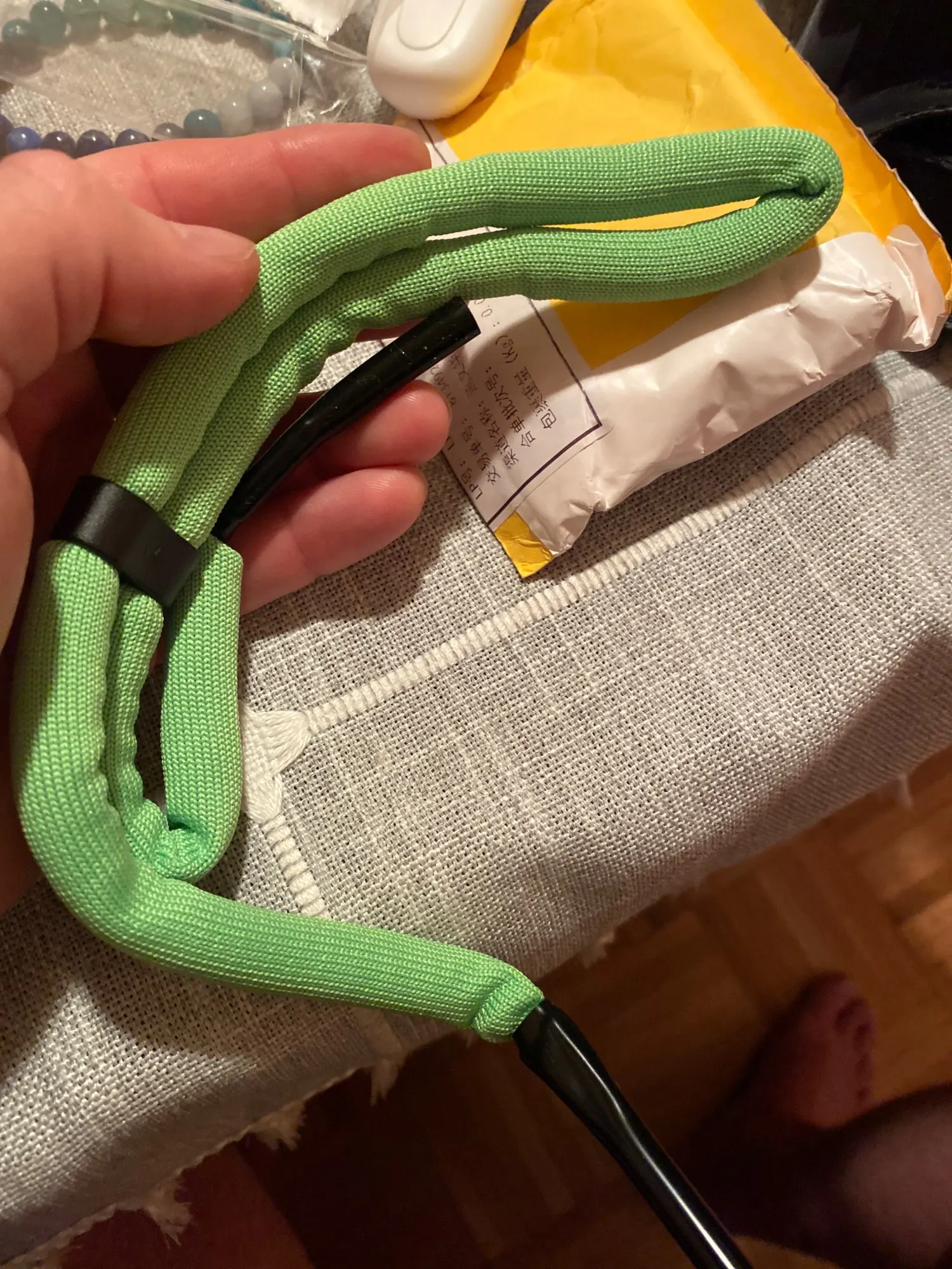 быстрая доставка,веревка толстая,наверное см в диаметре,упругая,сзади конец торчит как косичка,для рыбалки пойдет,очки точно не утонут с ней