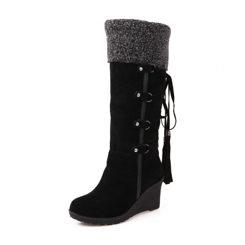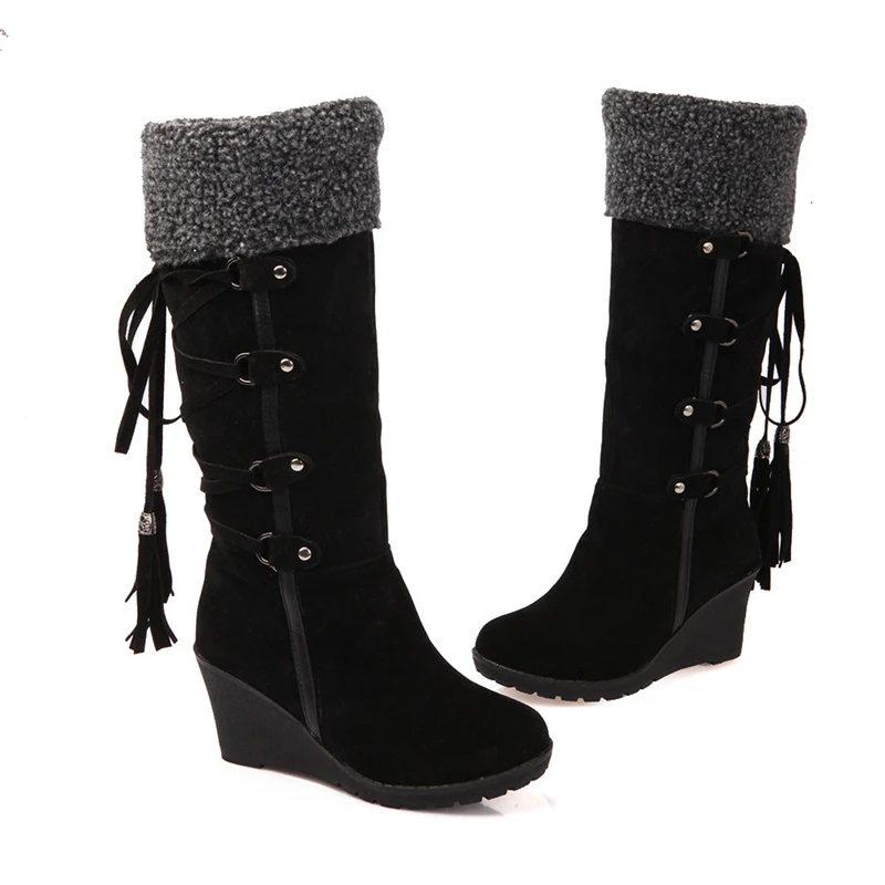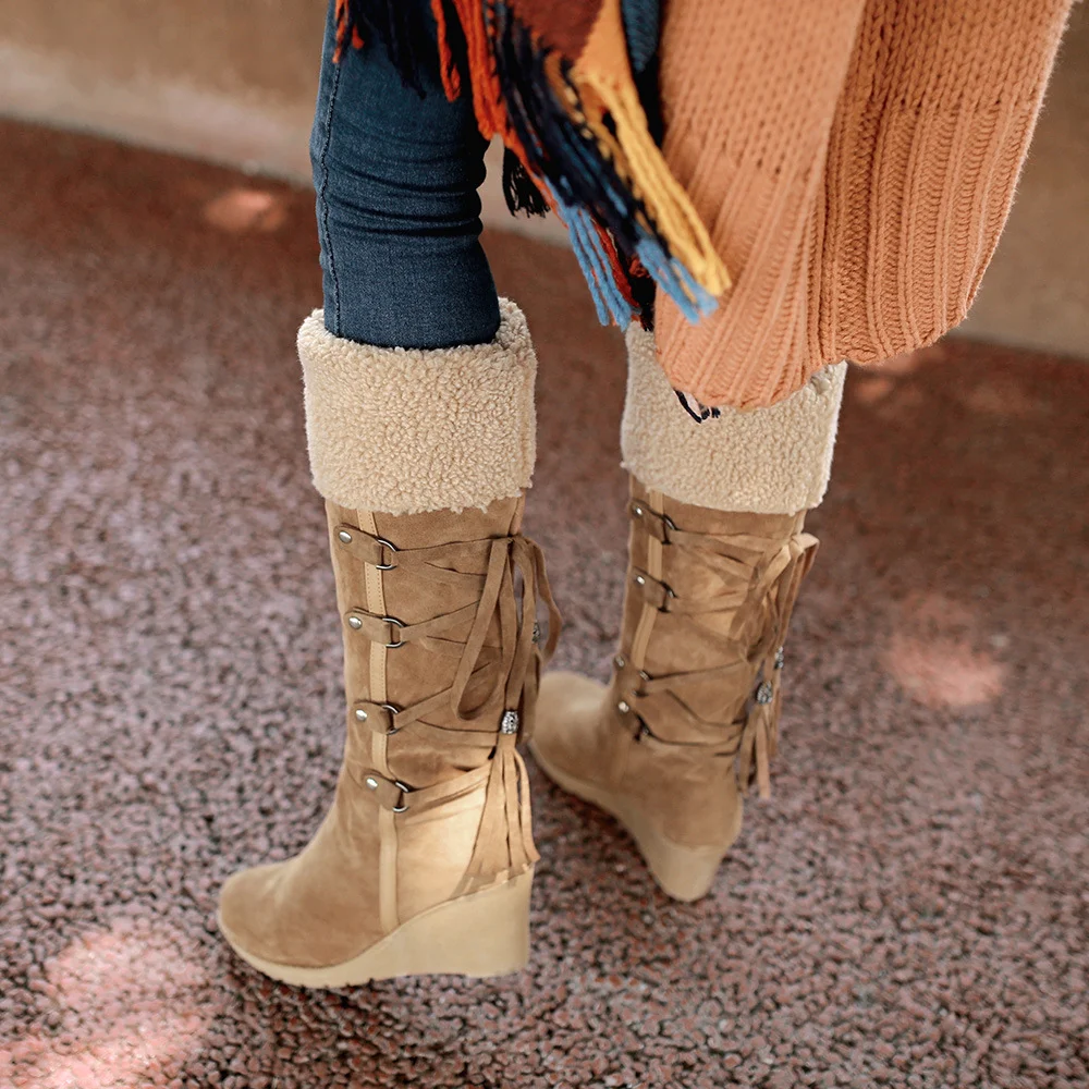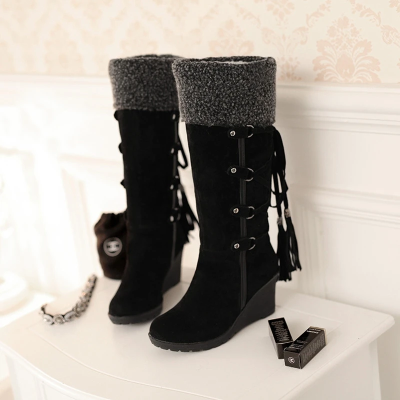 MoneRffiНовая женская обувь; зимние сапоги; женские сапоги; зимняя обувь на танкетке; женские сапоги до середины икры; теплые женские зимние сапоги на меху с бахромой