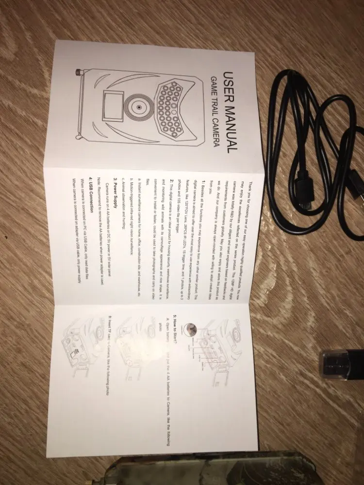 Игрушка, не надолго! В комплекте есть кабель -провод юсби, кард-ридер, ремень для крепления камеры и «Инструкция» на английском языке! На коробке нет ни номера модели, не производителя, ни фирмы ..... в шоке, мягко говоря! Провод вообще не входит в гнездо, так как оно чуть больше самого разъёма в камеру. Попробовали своим от андроидного телефона. Необходимо купить 4 пальчиковых батарейки! На корпусе есть плёнка на окошке светодиодных лампочках , перед использованием надо снять. Для пробы вставили карту памяти микро, после вставили в карт-ридер, в комп-ре просмотрели. На видео присутствовал звук. Но на фото качество явно не 12 мр. Ещё важный момент- установка времени на флэшке - файл «times” , самим надо настроить дату и время и «сохранить». Посылка отслеживалась, уведомление о поступлении в офис доставки пришло, все вовремя!
