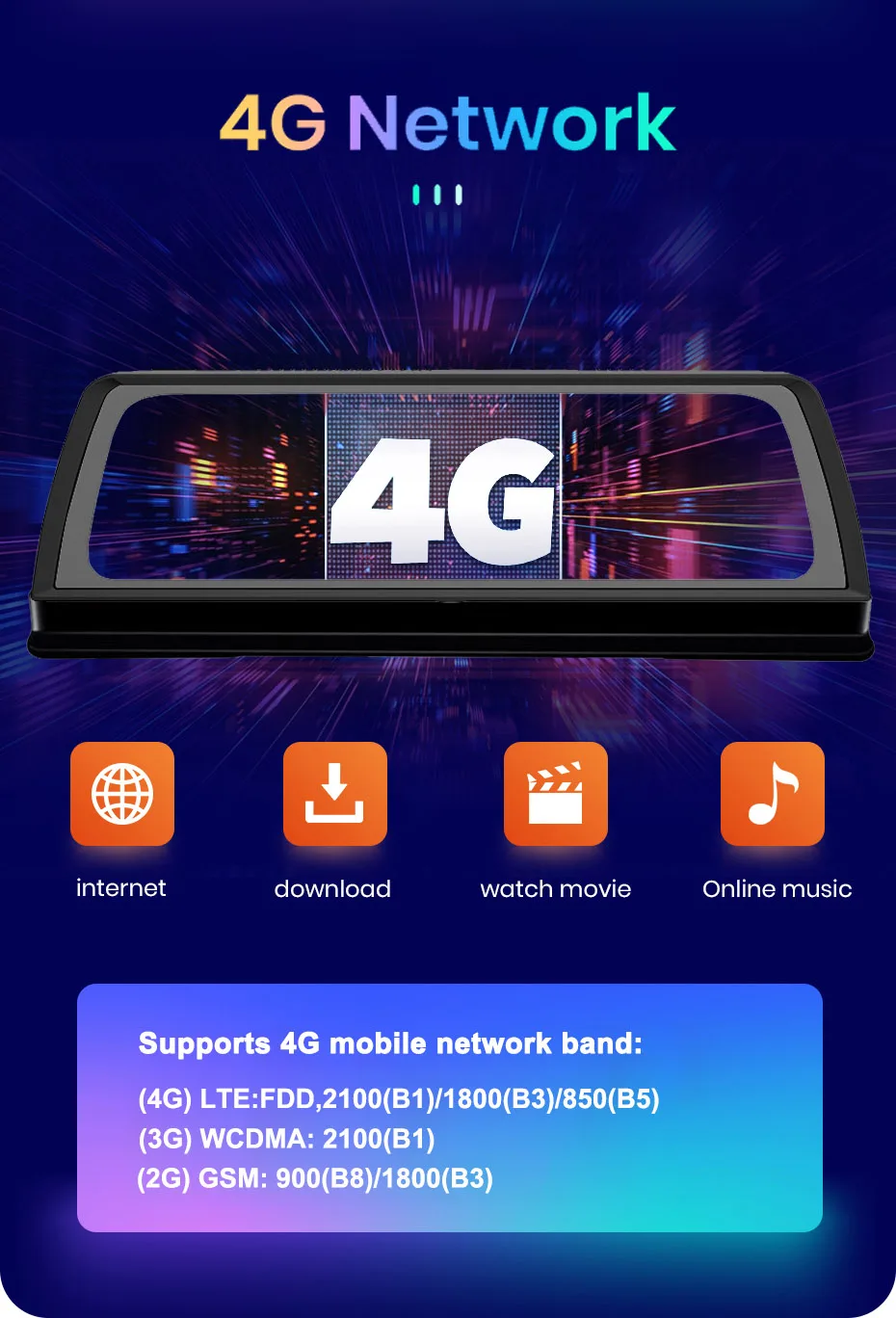 Поддерживает мобильную сеть 4G.Сетевой диапазон:(4G) LTE:FDD,2100(B1)/1800(B3)/850(B5);(3G) WCDMA: 2100(B1);(2G) GSM: 900(B8)/1800(B3);Делает ваш видеорегистратор серфингом в Интернете, в любое время и в любом месте.Примечание:Перед покупкой проверьте свой местный сетевой диапазон 4G. Спасибо.