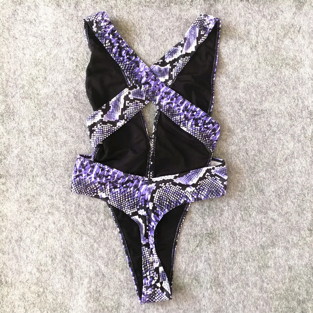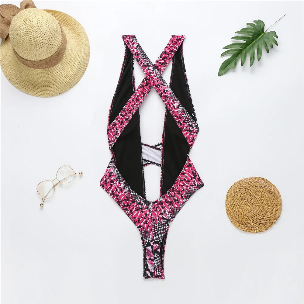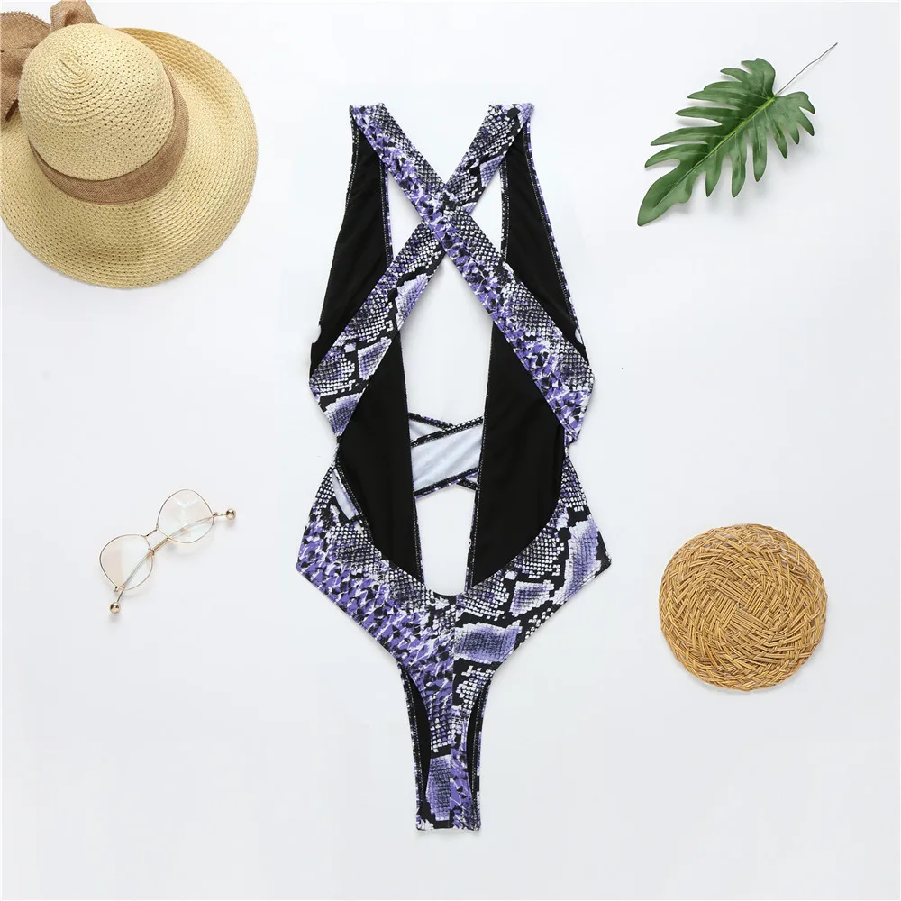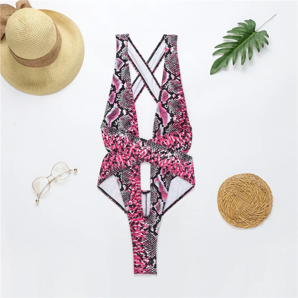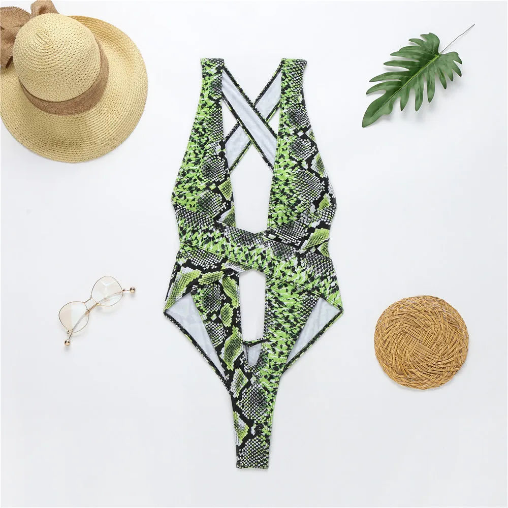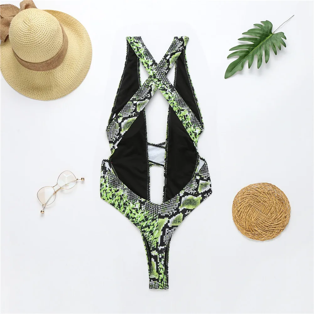 Сексуальный слитный купальник-монокини для женщин 2022 неоновый зеленый змеиный принт бандажный купальник с вырезами стринги женский купальный костюм с высоким вырезом
