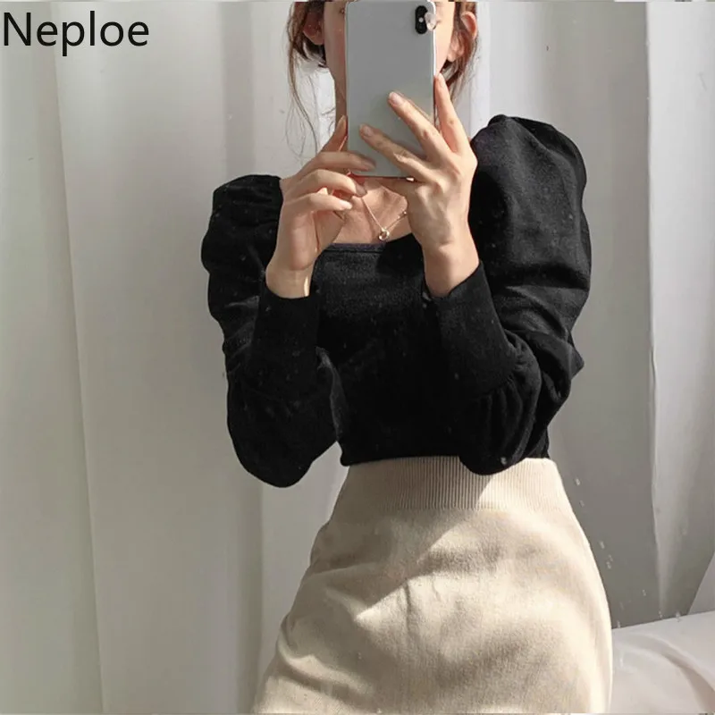 Шикарная футболка Neploe с квадратным воротником и вырезами до ключиц, облегающие плиссированные однотонные Блузы с пышными рукавами, Новинка осени-весны 2022, вязаный Топ