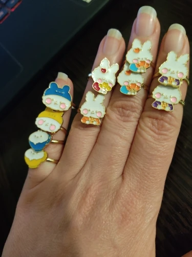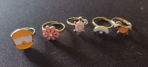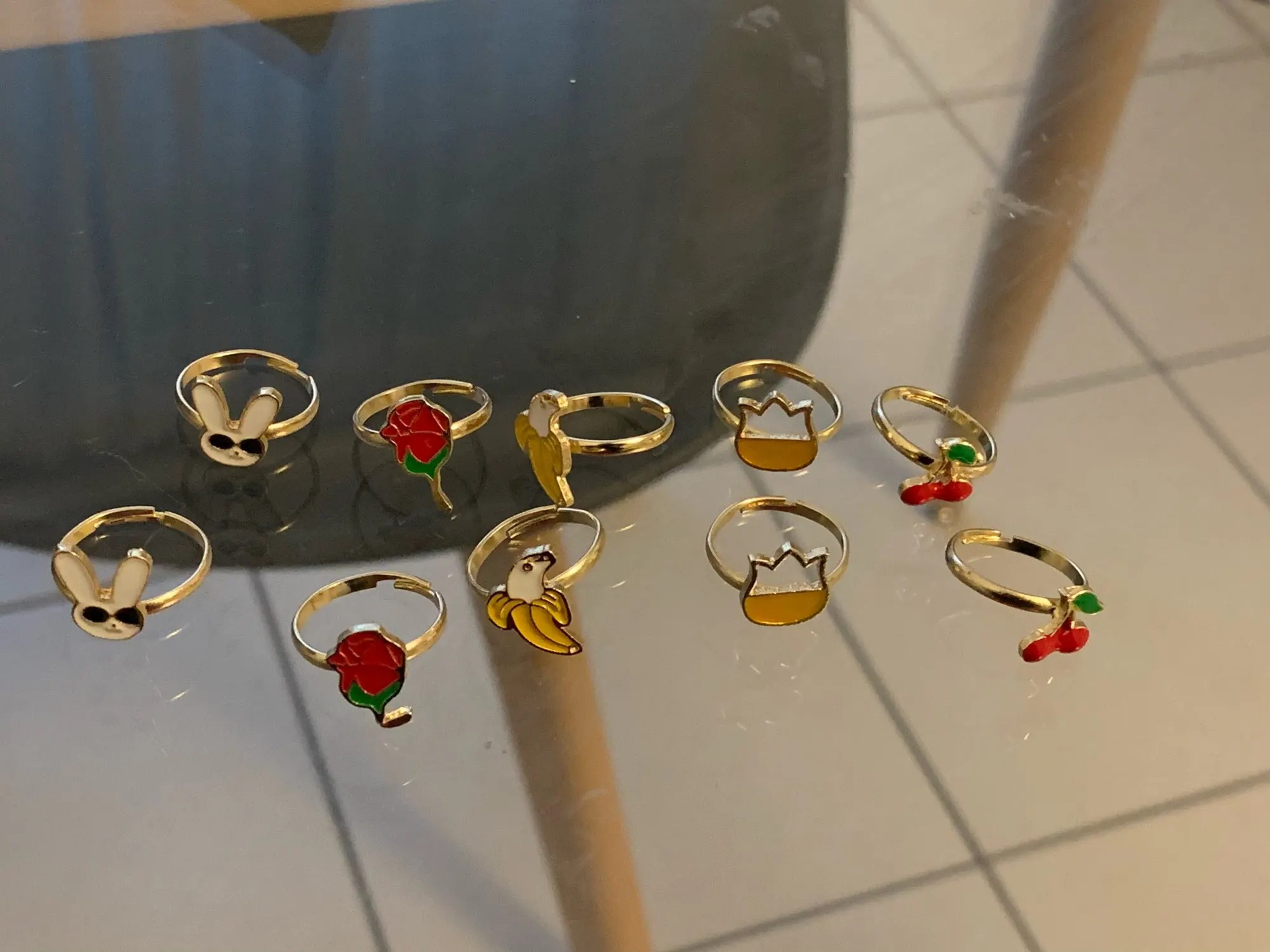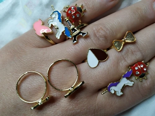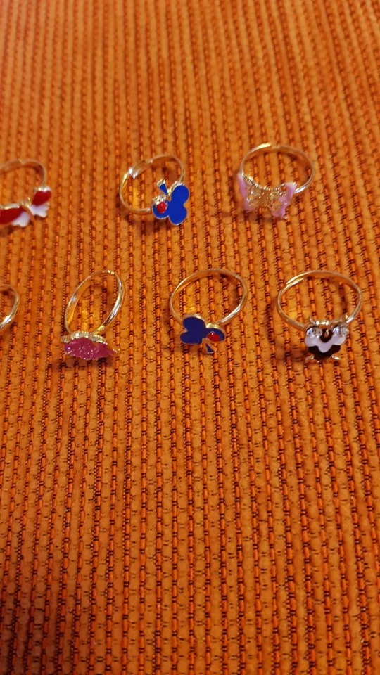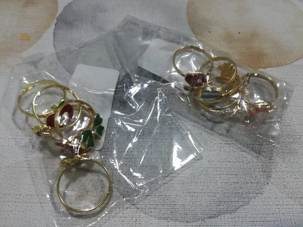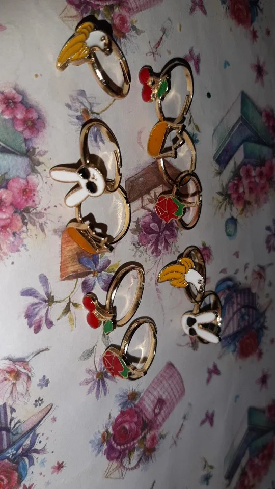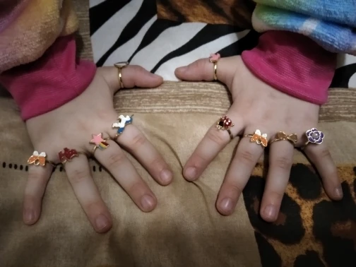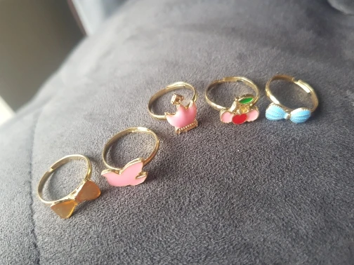 Заказ 2 набора по 10 колечек. Из 20 штук - 5 колечек с повтором. Получилось из 20- 15 колечек разные. Не обязательно что будут такие, как на скриншоте. Колечки регулируются. Деткам понравится. Рекомендую к сотрудничеству.