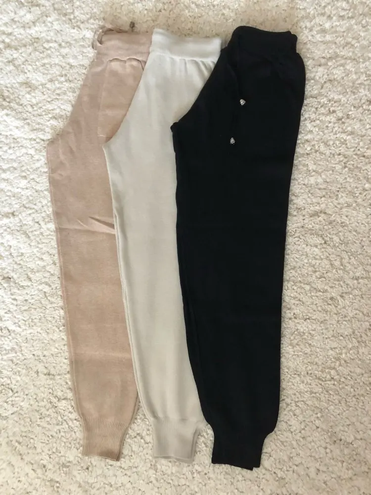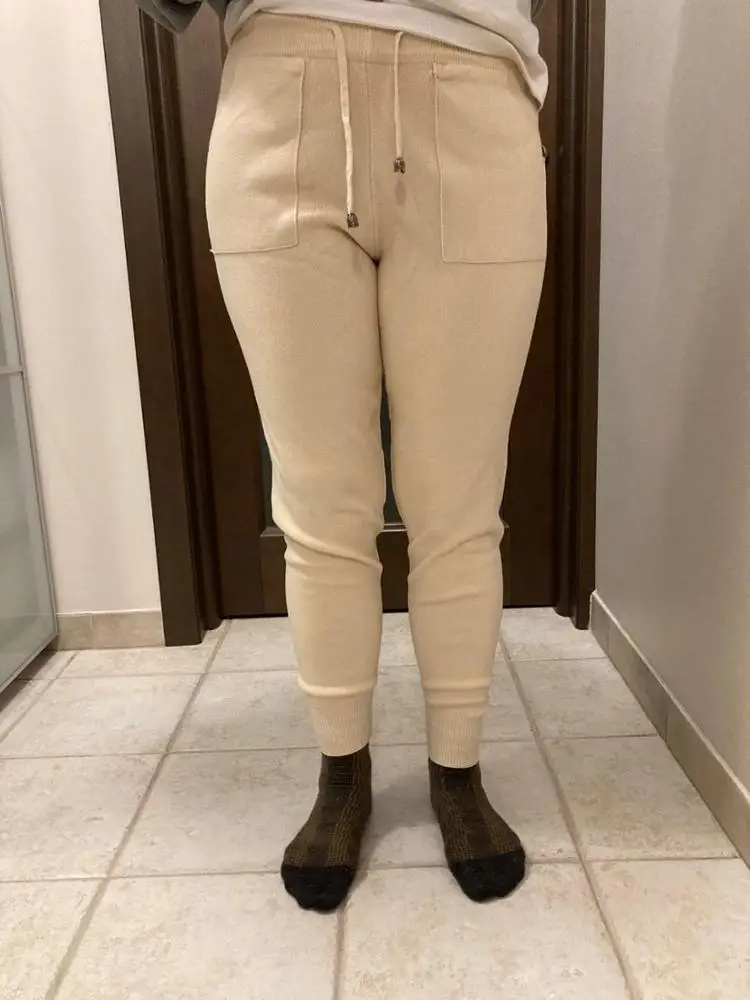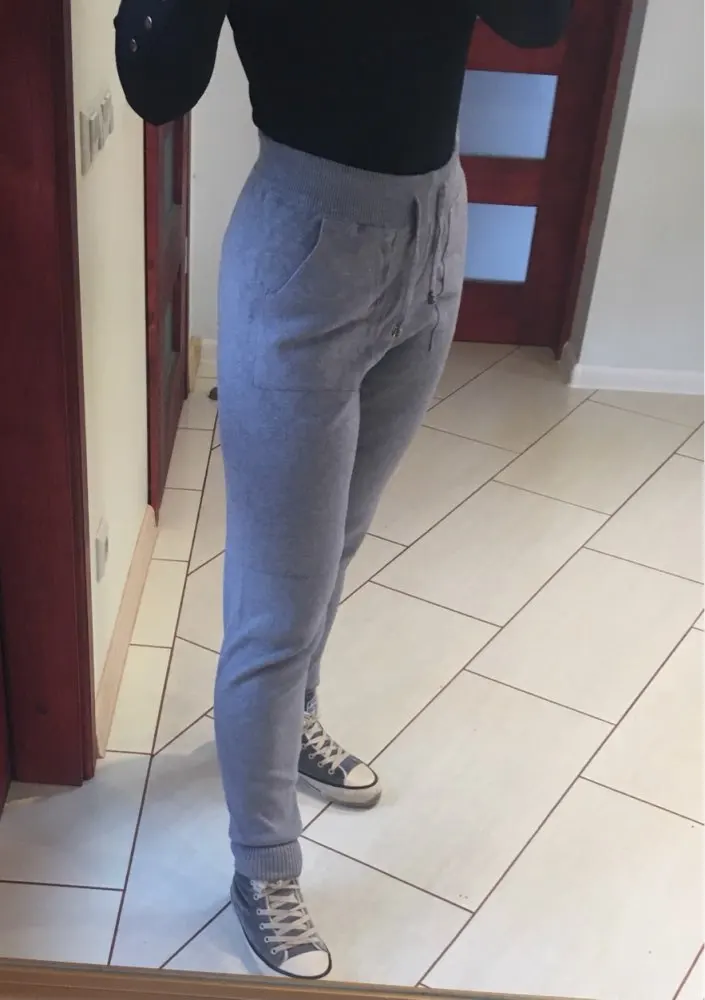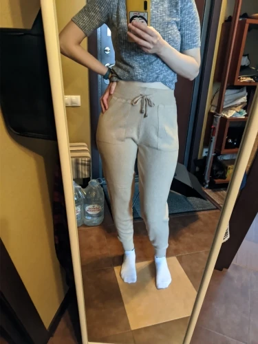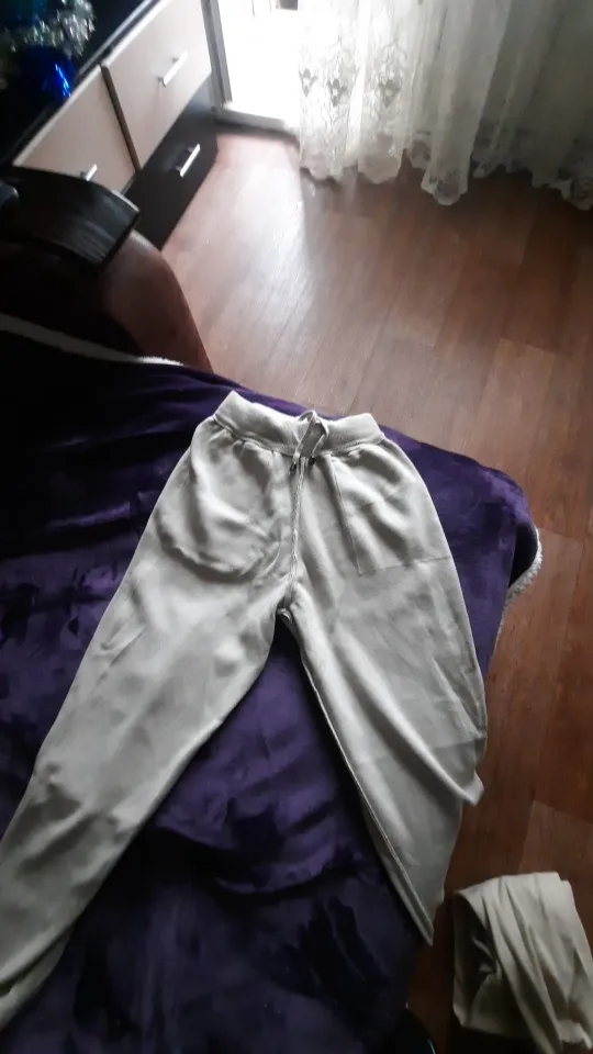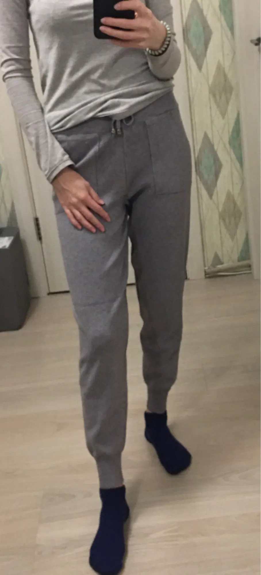 Брюки выполнены из качественного трикотажа, прекрасно тянутся, не притягивают к себе всякие пылинки) Единственное, на XS, даже с моим беременным животом, штанины очень оверсайз смотрятся, на фото видно. Лучше всего подойдут для девушек с размером М. По длине на рост 157 отлично. Очень мягкие, комфортные, на южную зиму в самый раз)).