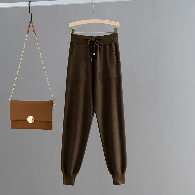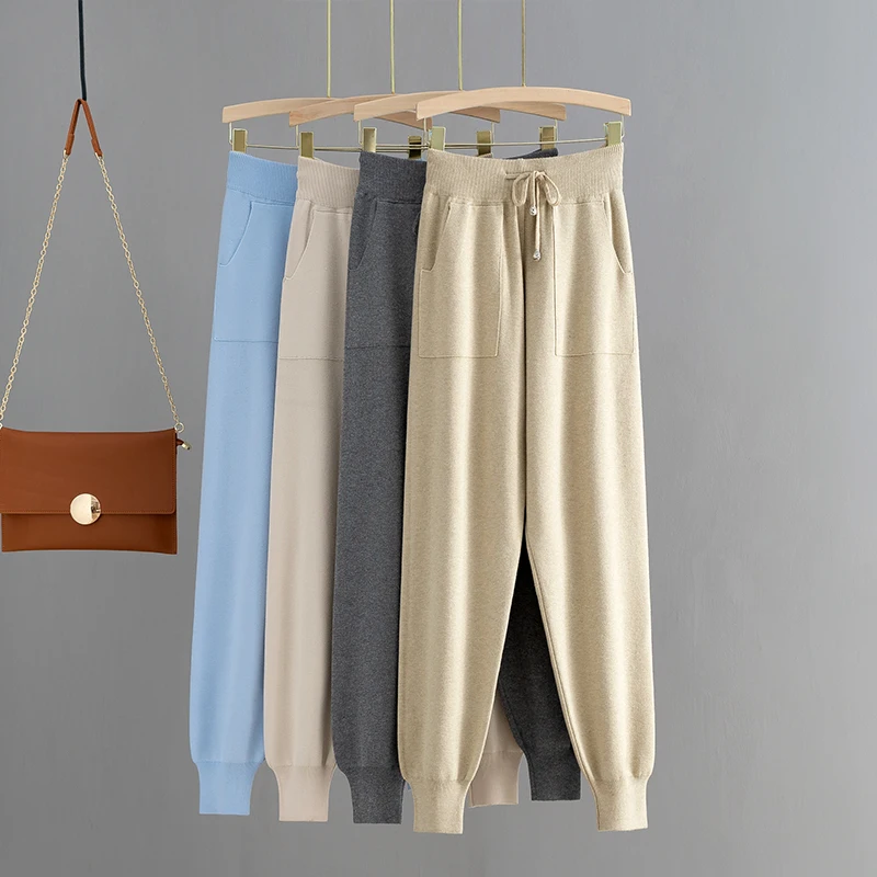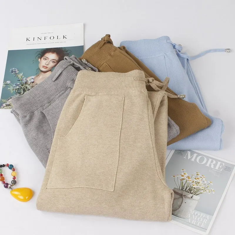 Штаны-шаровары женские зимние трикотажные с высокой талией и шнурком