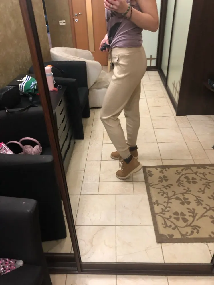 По поводу размера. Штаны максимум размер М и на талию в 55 см, и ростом не выше 164 см. Или если у вас 170, но не пропорционально короткие ноги, такие фигуры тоже бывают, тоже подойдёт. У меня же наоборот не пропорционально очень длинные ноги при росте 170, по длине штаны до косточек щиколоток не доходят, коротко ваты, но под ботинки хорошо, мне так и надо, не нравятся, когда шароварами из подботинок подвисают. Талия 74, бедра 100. В попе все ок, но вот в талию вставила доп резинку длинной в 20см, потому как по талии штаны на мою 5 летнюю дочь. Цвет. Цвет априкот, который заказала, оказался совсем ни как на фото, не молочный далеко, а, скорее хаки, серозеленоватые. Либо не в том цвете прислали, либо априкот не соответствует фото. Но все равно оставила. Заказала у другого продавца а молочного цвета, может там повезёт. Качество отличное. Но на маленьких миниатюрный женщин или максим на средних.