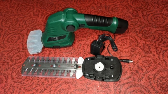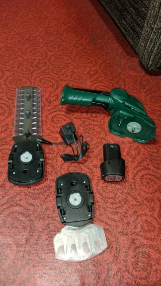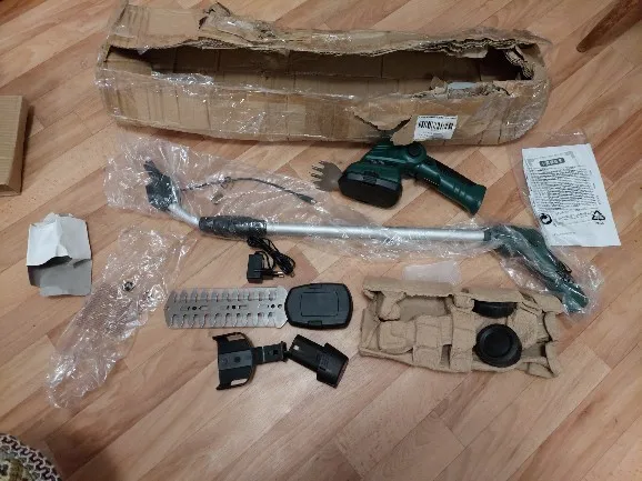 Получила постригальный прибор для травы. В наборе ножницы и нож - пила, и шнур для подзарядки. Зарядил, попробовала в деле, побила траву в трудно доступных местах быстро и без сбоев. Интересный прибор, мне понравился, покупкой довольна! Спасибо за быструю доставку - 2 недели.