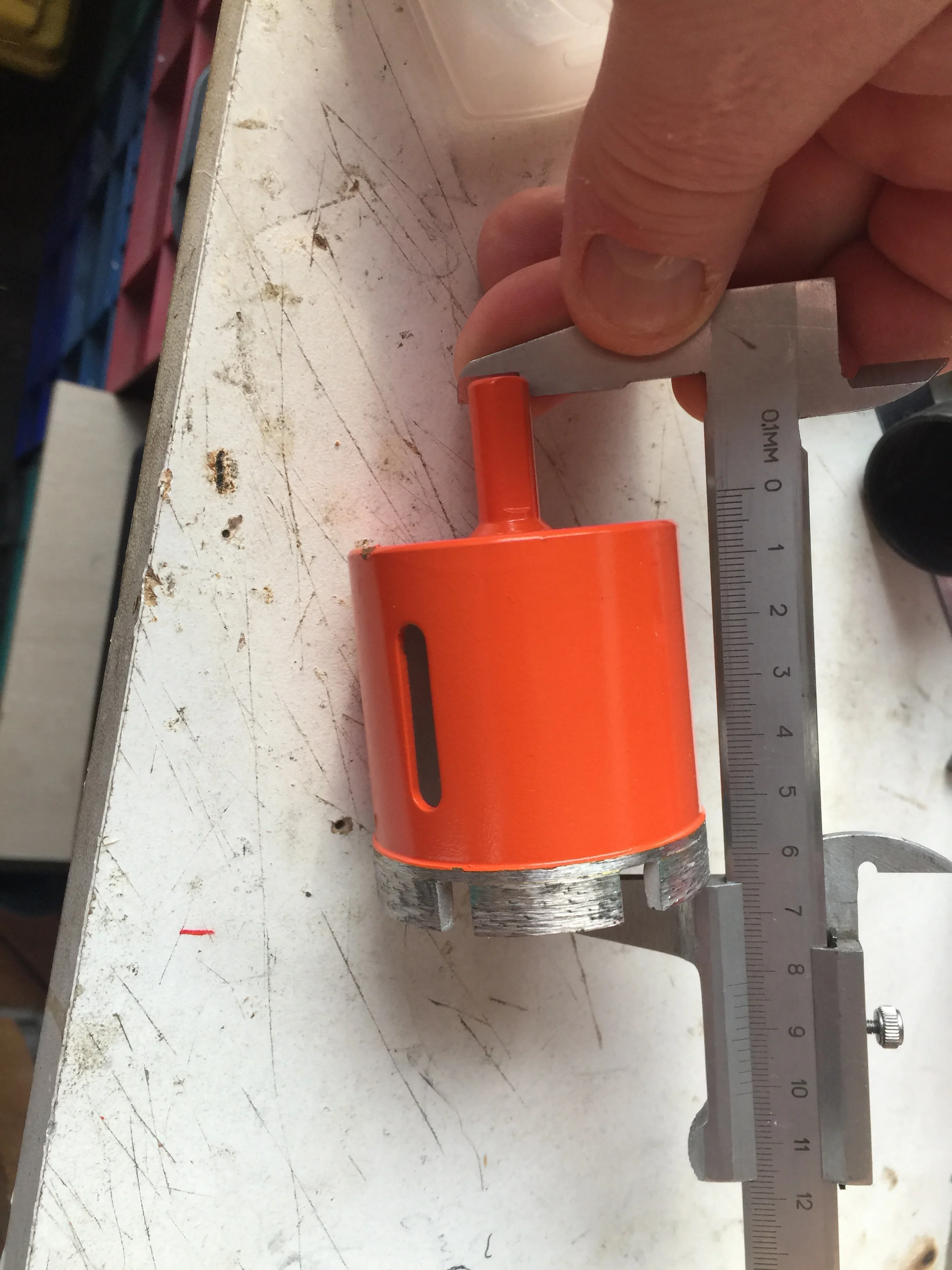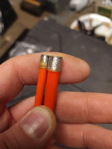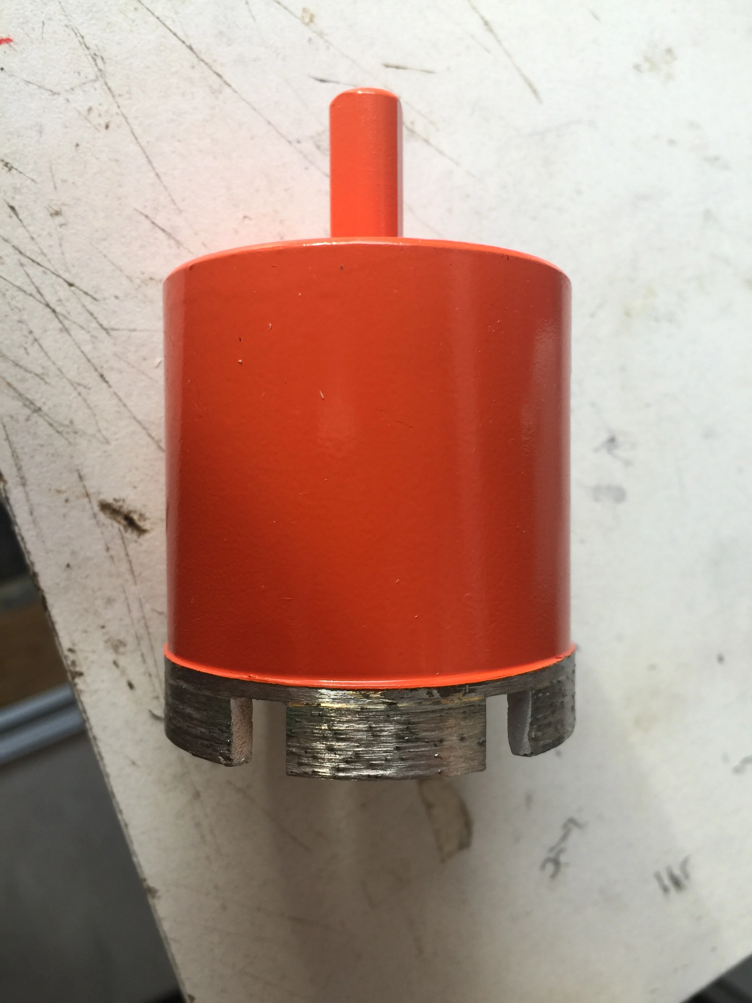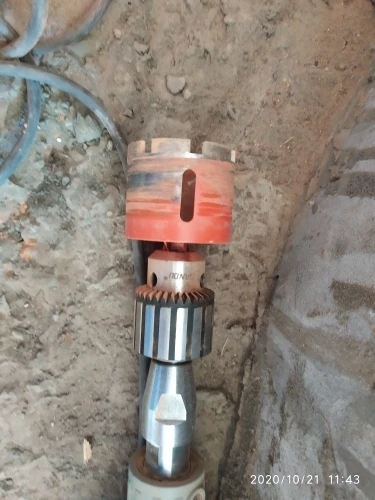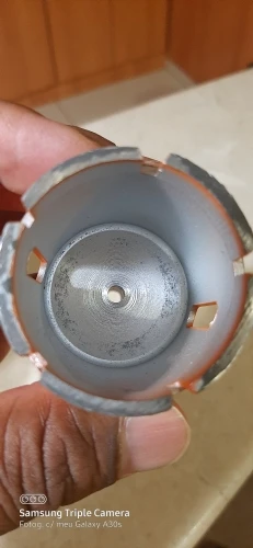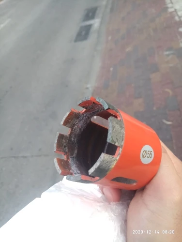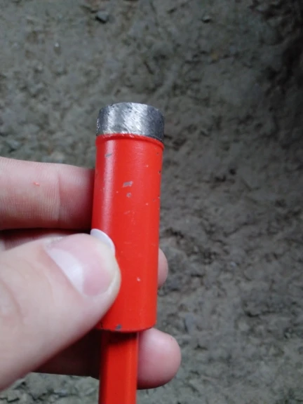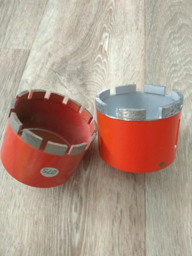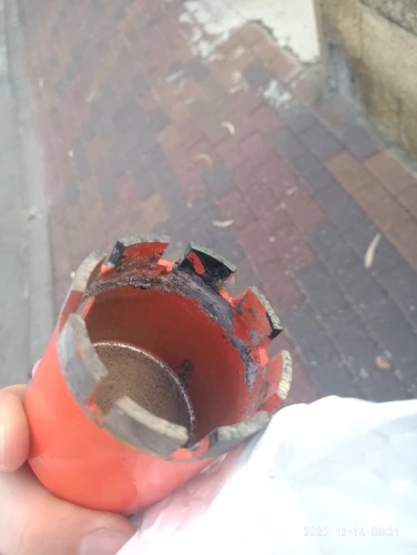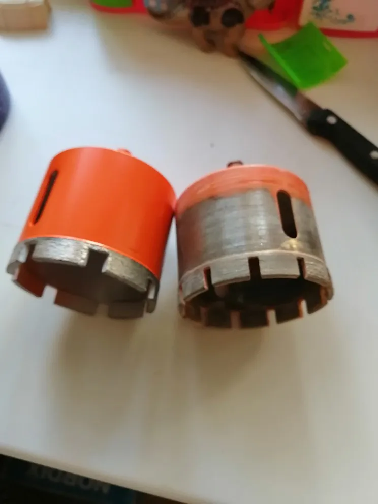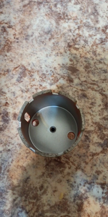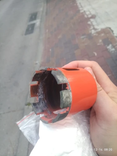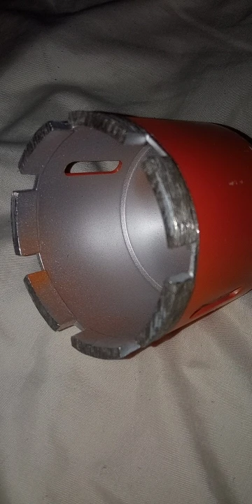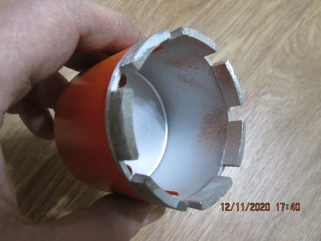 Внешне режущая кромка выглядела подозрительно, мало покрытая алмазной крошкой. Просверлил 25 отверстий, алмазы остались, но коронку закусило за арматуру, перфоратор вывернуло и коронку погнуло. Корпус из алюминиевого сплава.
