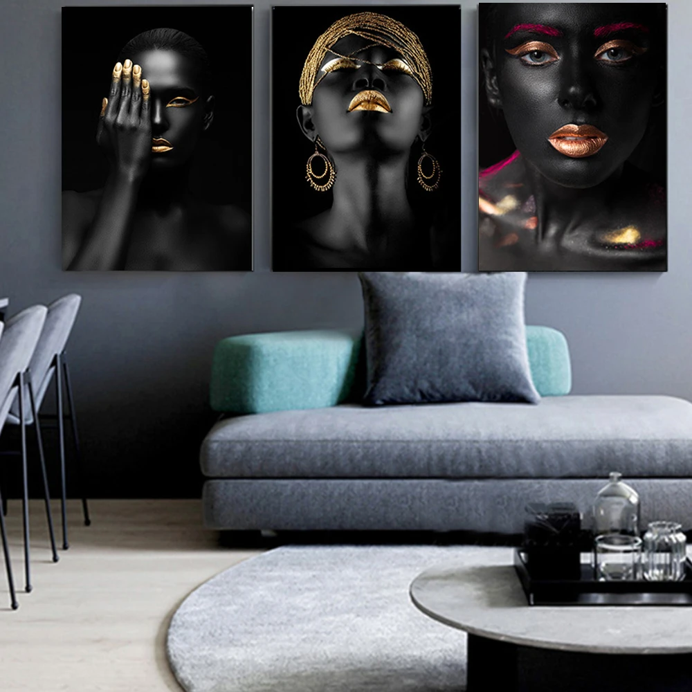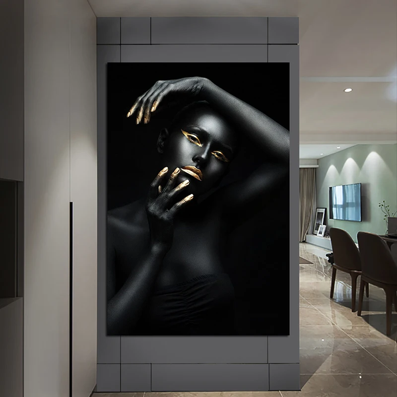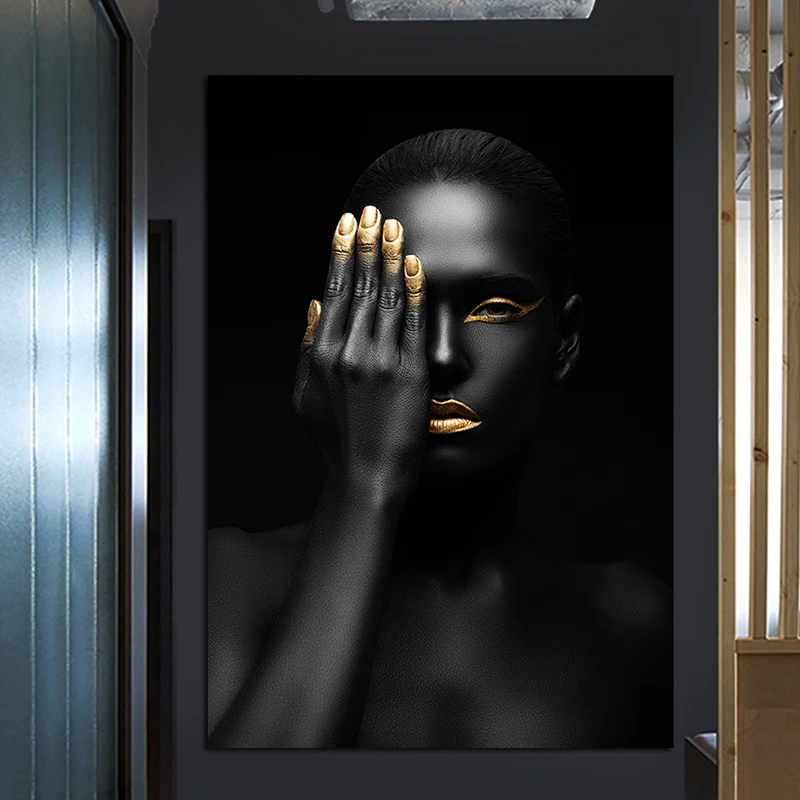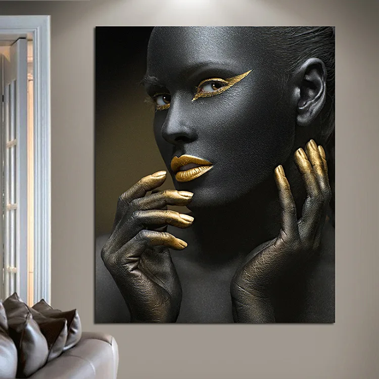 Привлекательные черные, Золотые губы, Обнаженная женщина, держащая ее глаза, холст, живопись, плакаты и принты, современные настенные картины для гостиной