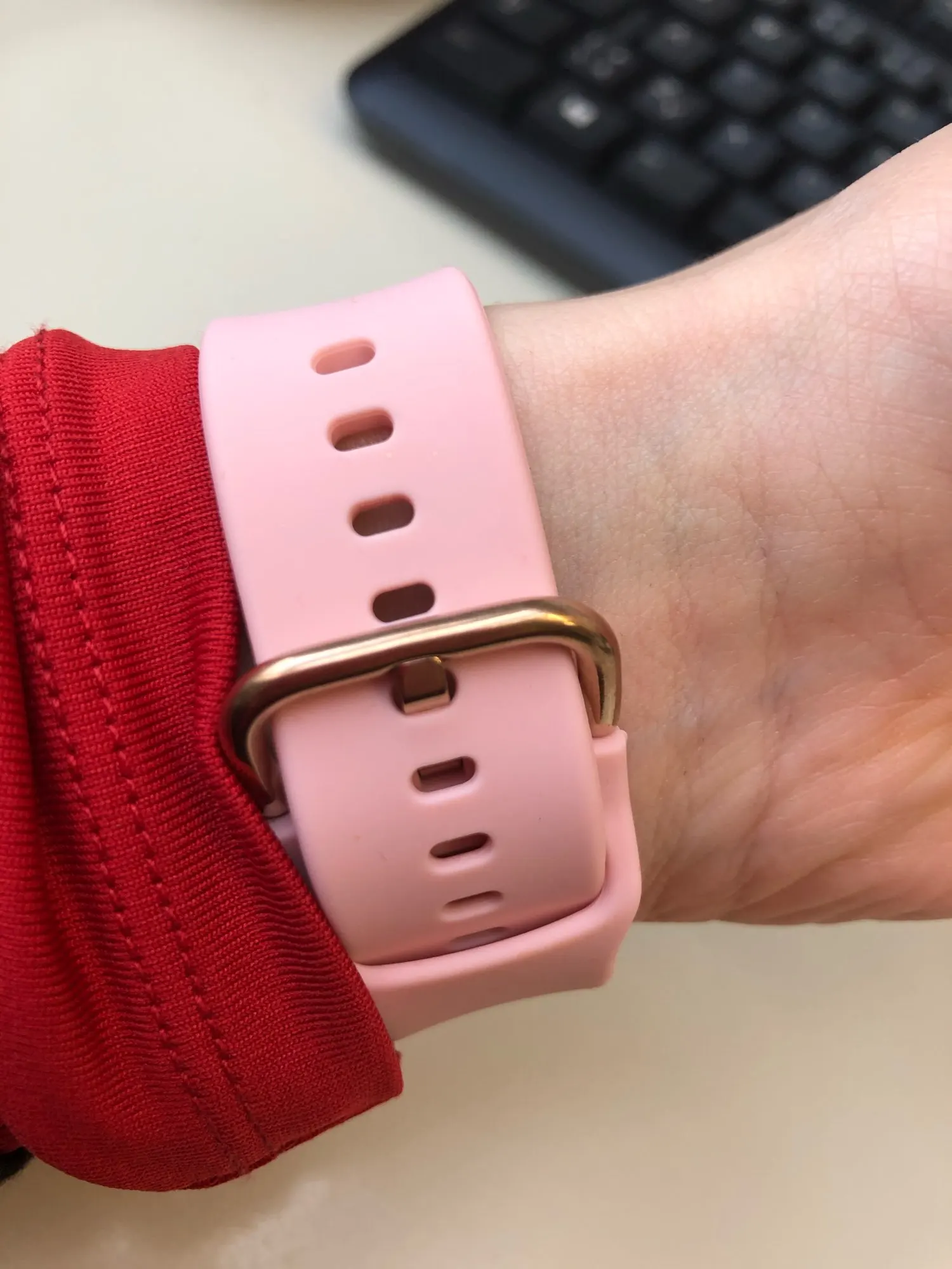 Очень долго шла посылка. Цвет яркий розовый (гораздо ярче, чем на фото), что разочаровало, потому что искала бледный розовый. А вообще обычный силиконовый ремешок с хорошим диапазоном застёжки, при необходимости даже на детскую руку подойдет, наверное.