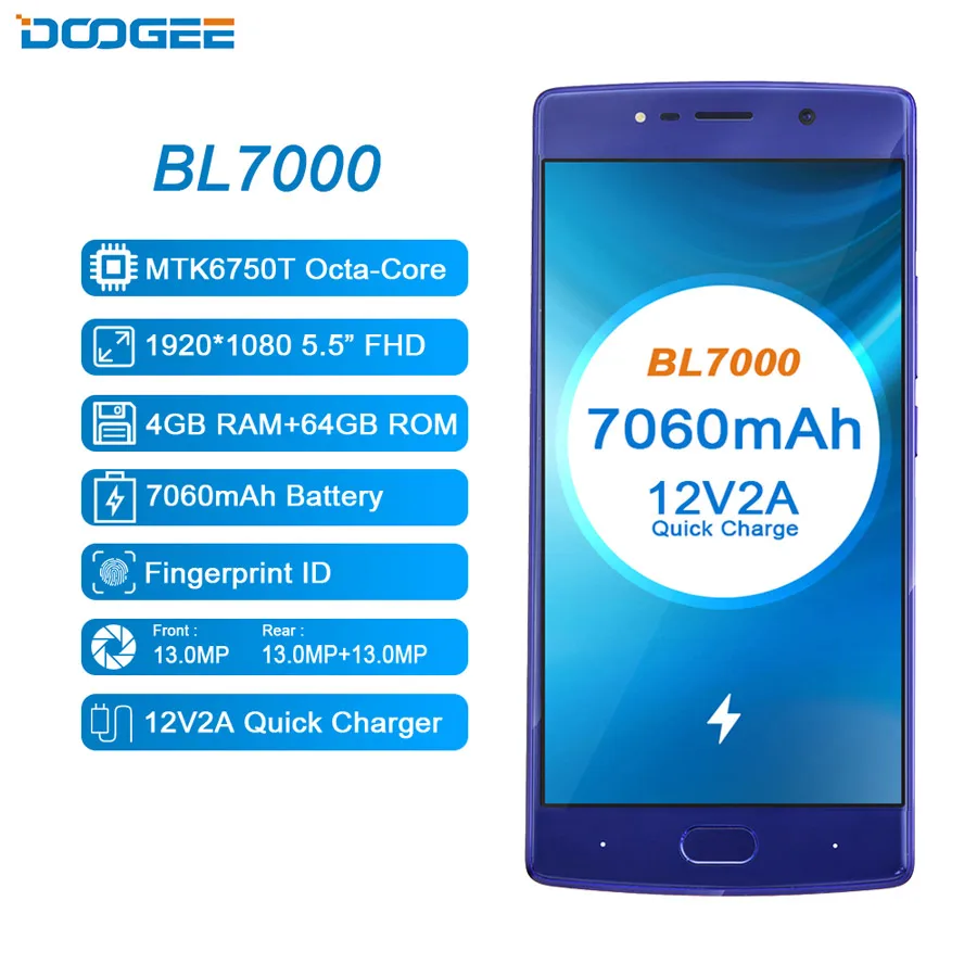 Смартфон DOOGEE BL7000, 4+64 Гб, процессор MTK6750T Octa Core, экран 5.5'' FHD, двойная камера 13 мп, Android 7.0, аккумулятор 7060 мАч, быстрая зарядка 12 В