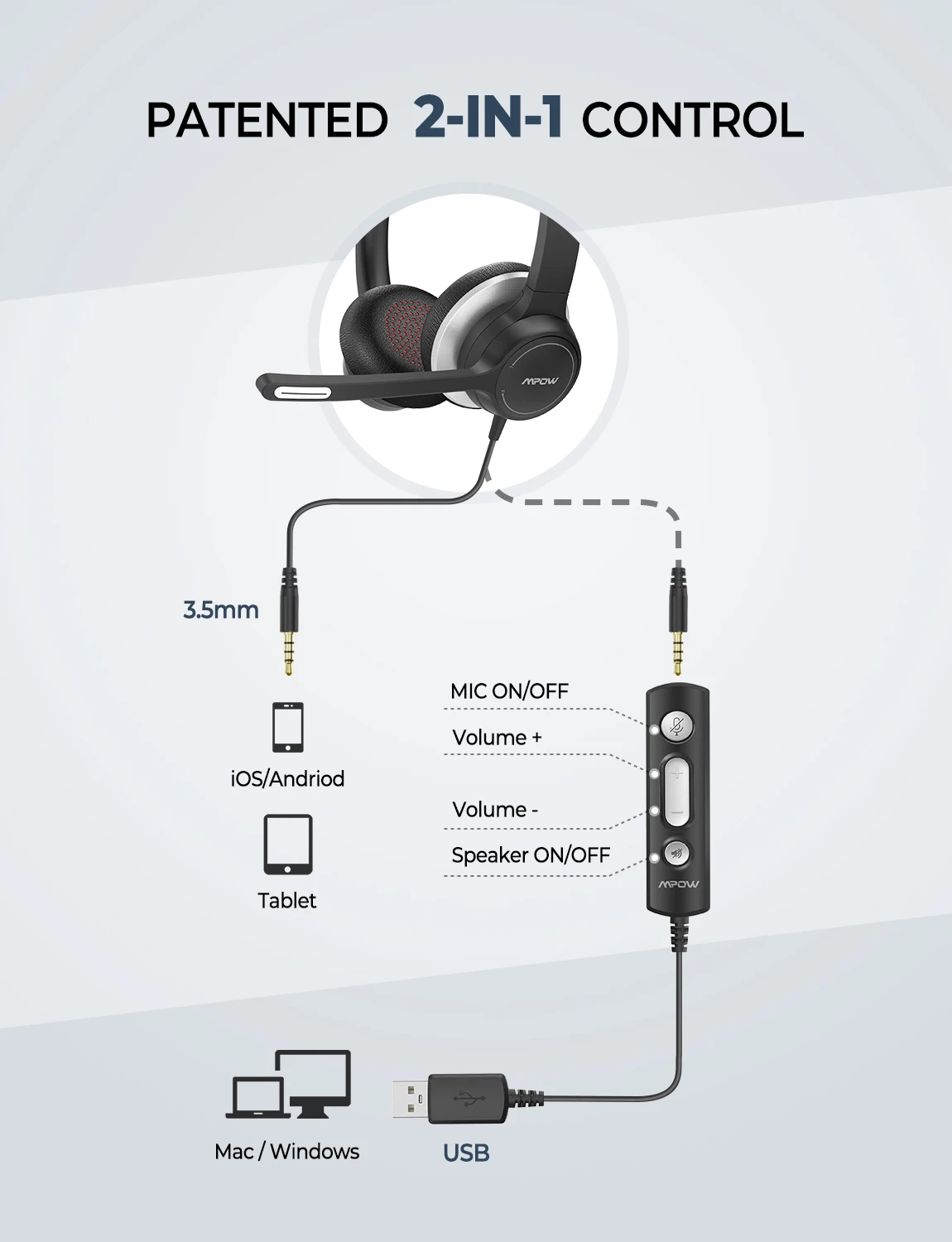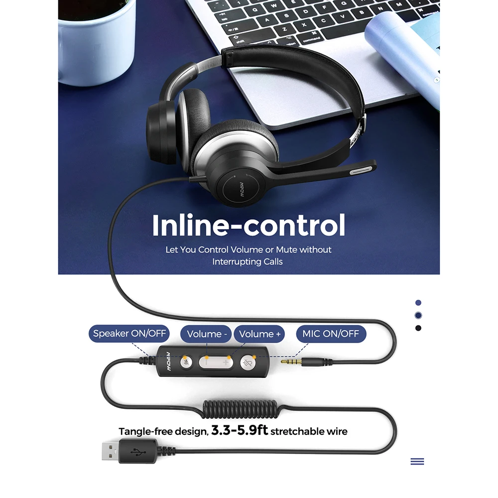 Проводная USB гарнитура Mpow HC6Компьютерная гарнитура 3,5 мм с микрофоном, наушники с линейным управлением для колл-центра, Skype, ПК, сотового телефона