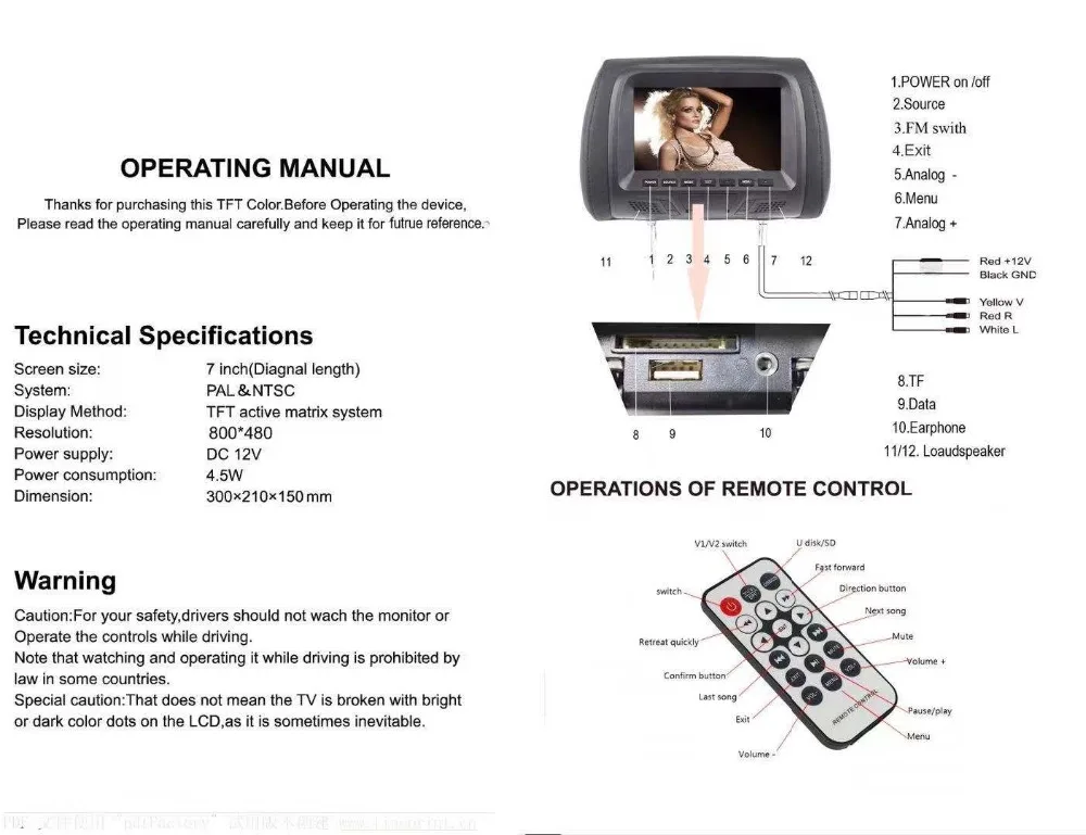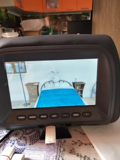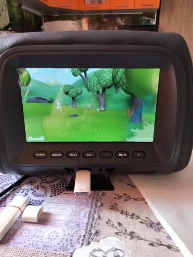 Товар пришел очень быстро. Это радует! Спасибо продавцу! Упаковано хорошо, угол коробки немного помялся, но товар не повредился. Качество материала из которого сделан подголовник (кожзам) оценить сложно. Очень надеюсь что он не начнет расползаться и расслаиваться через полгода. С обратной стороны достаточно жесткий поролон. Наклон подголовника регулируется в широком диапазоне. USB работает, все читается. Разъем под наушники тоже работает нормально. Стационарные колонки выдают хороший и громкий звук, но к сожалению с полным отсутствием баса. К пульту нужна батарейка (нет в комплекте) CR2025, также подходит CR2032. По функциям: Есть русский язык! Экран не сенсорный, очень красочный, яркость регулируется в настройках и через пульт. С подголовника нельзя оперативно регулировать звук, только с пульта. Во время воспроизведения кнопки + и - служат для переключения на другой файл. Поэтому берегите пульт, он достаточно хрупкий. Недостатки: немного фонит в колонках во время загрузки файла.