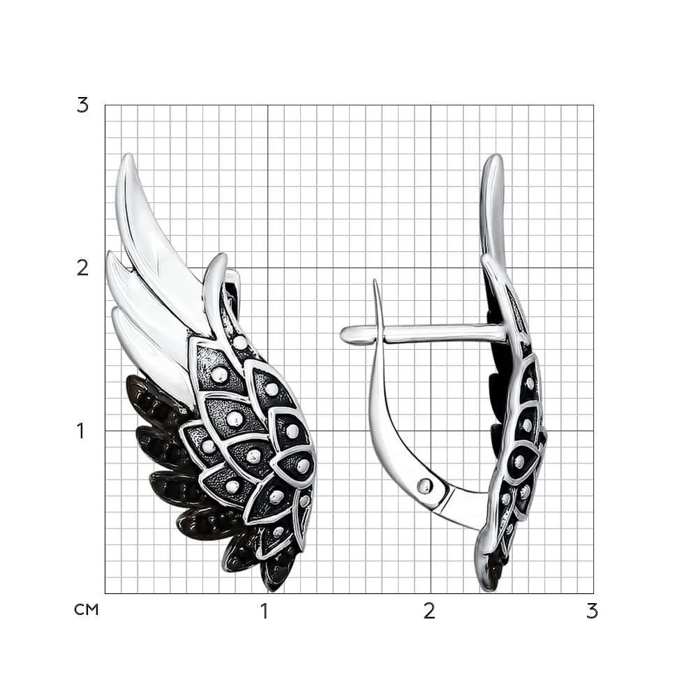 Серьги «Крылья» SOKOLOV из серебра с чернениемРасправьте крылья и устремляйтесь навстречу новым свершениям! Смело примеряйте свободные образы вместе с серебряными серьгами, декорированными эффектным чернением. Этот независимый стиль украшения идеально дополнит чёрную кожаную куртку или броские аксессуары, выдержанные в стилистике поклонников рок-музыки.