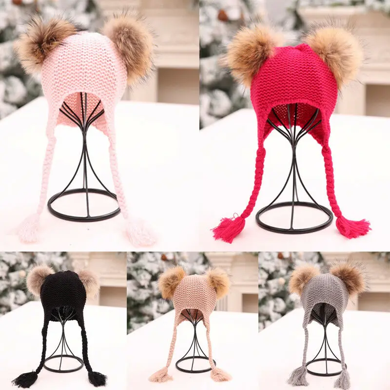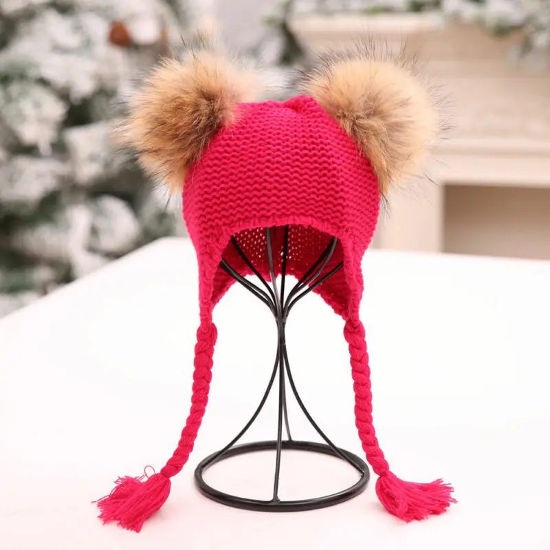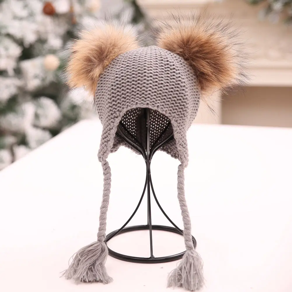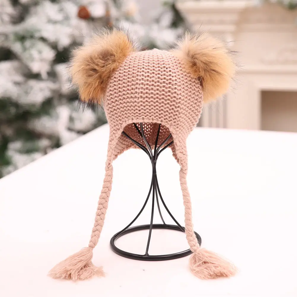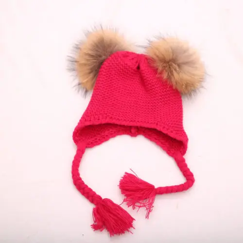 Шапка-бини детская, для мальчиков и девочек, зимняя, вязаная, с двойным мехом, розовая, красная, бежевая, с помпоном-кисточкой