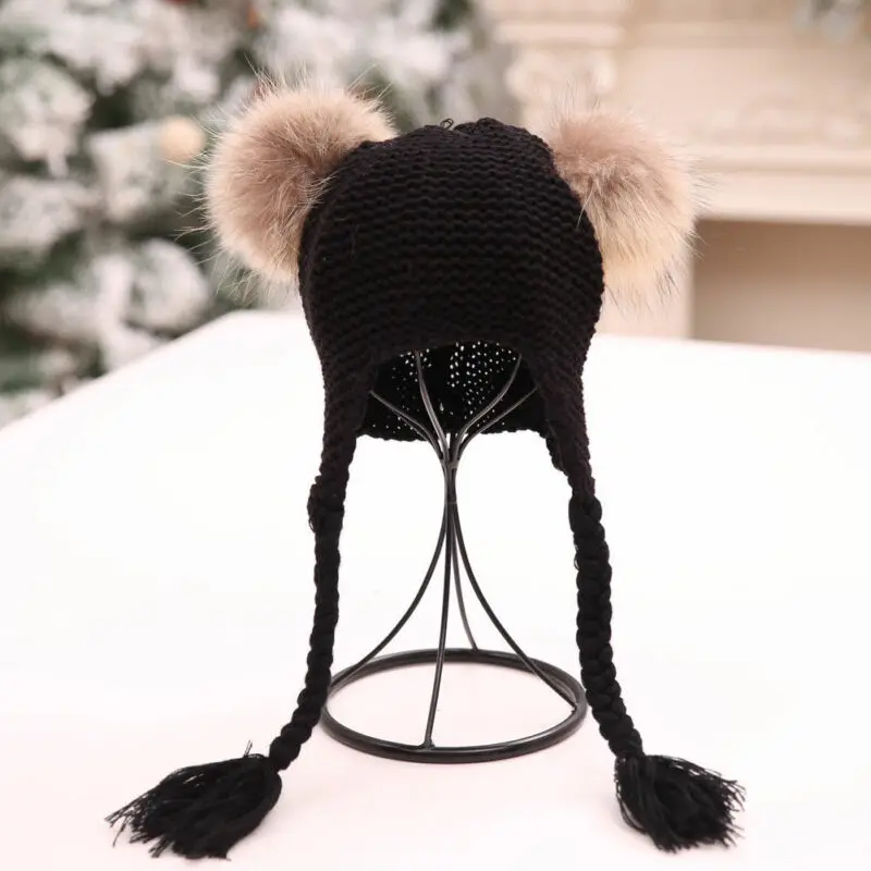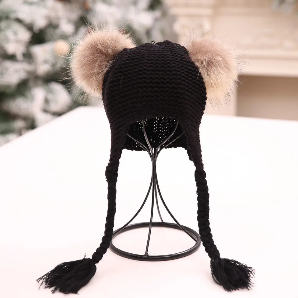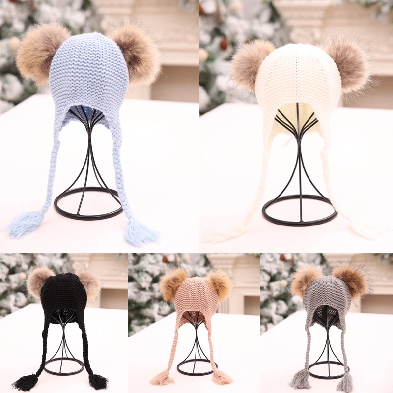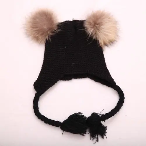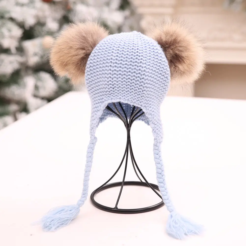 Шапка-бини детская, для мальчиков и девочек, зимняя, вязаная, с двойным мехом, розовая, красная, бежевая, с помпоном-кисточкой