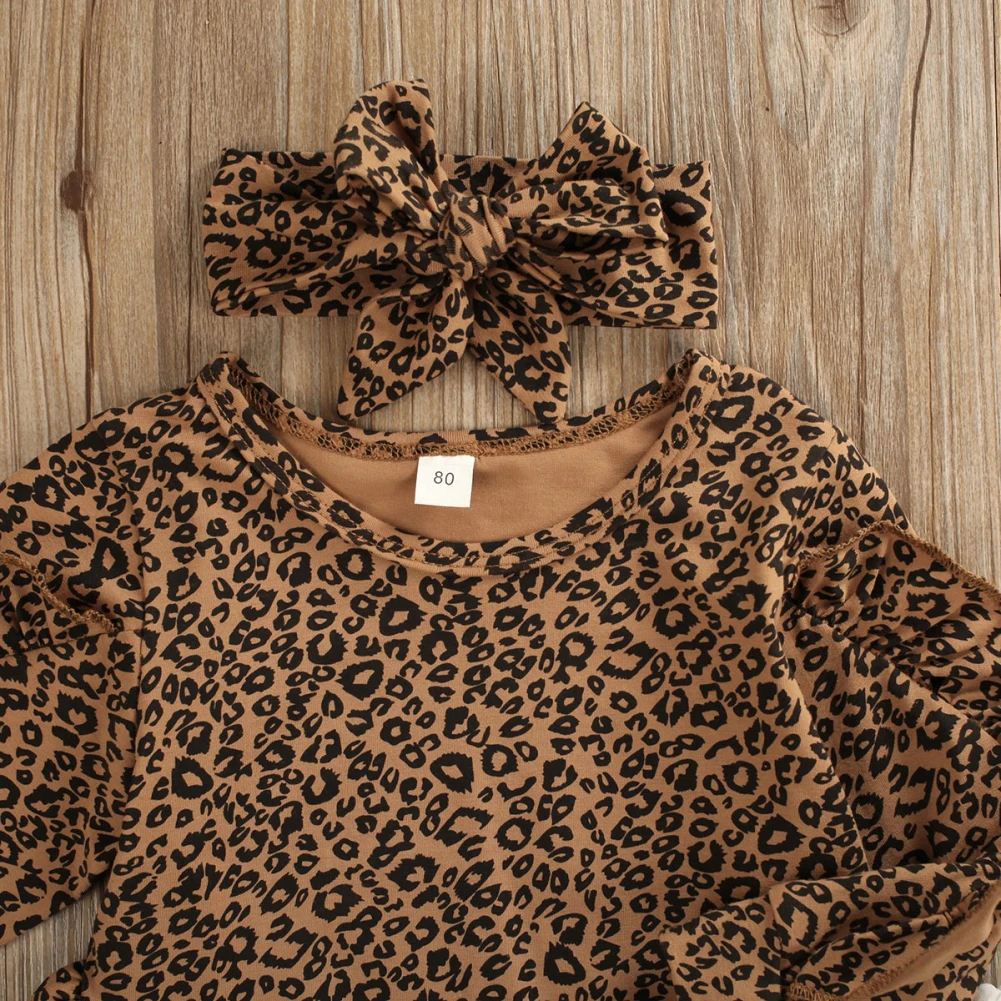 Осенний комплект одежды для маленьких девочек из 3 предметов, Топ с длинным рукавом и оборками, леопардовые топы, леггинсы, штаны, повязка на голову, комплект одежды, спортивный костюм