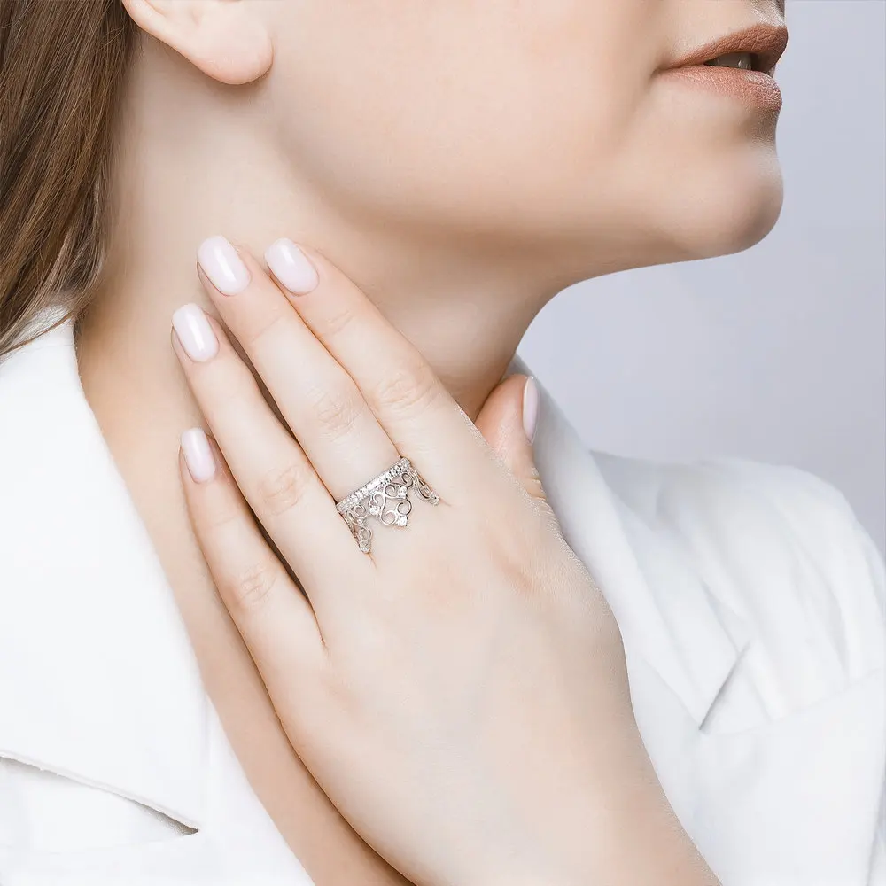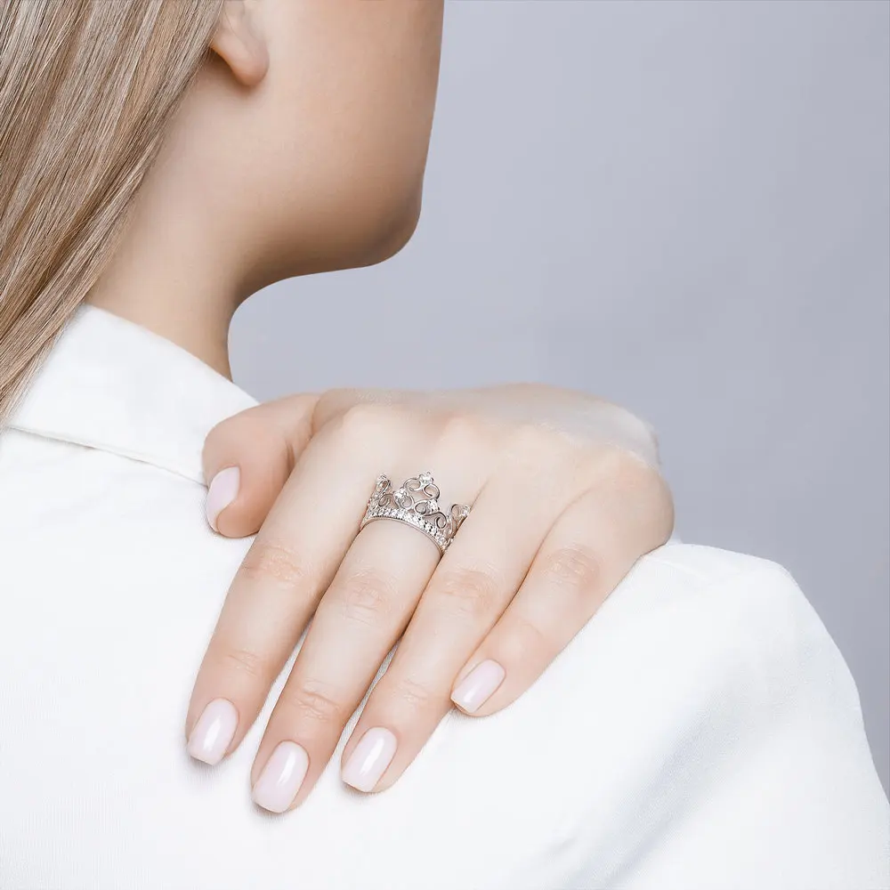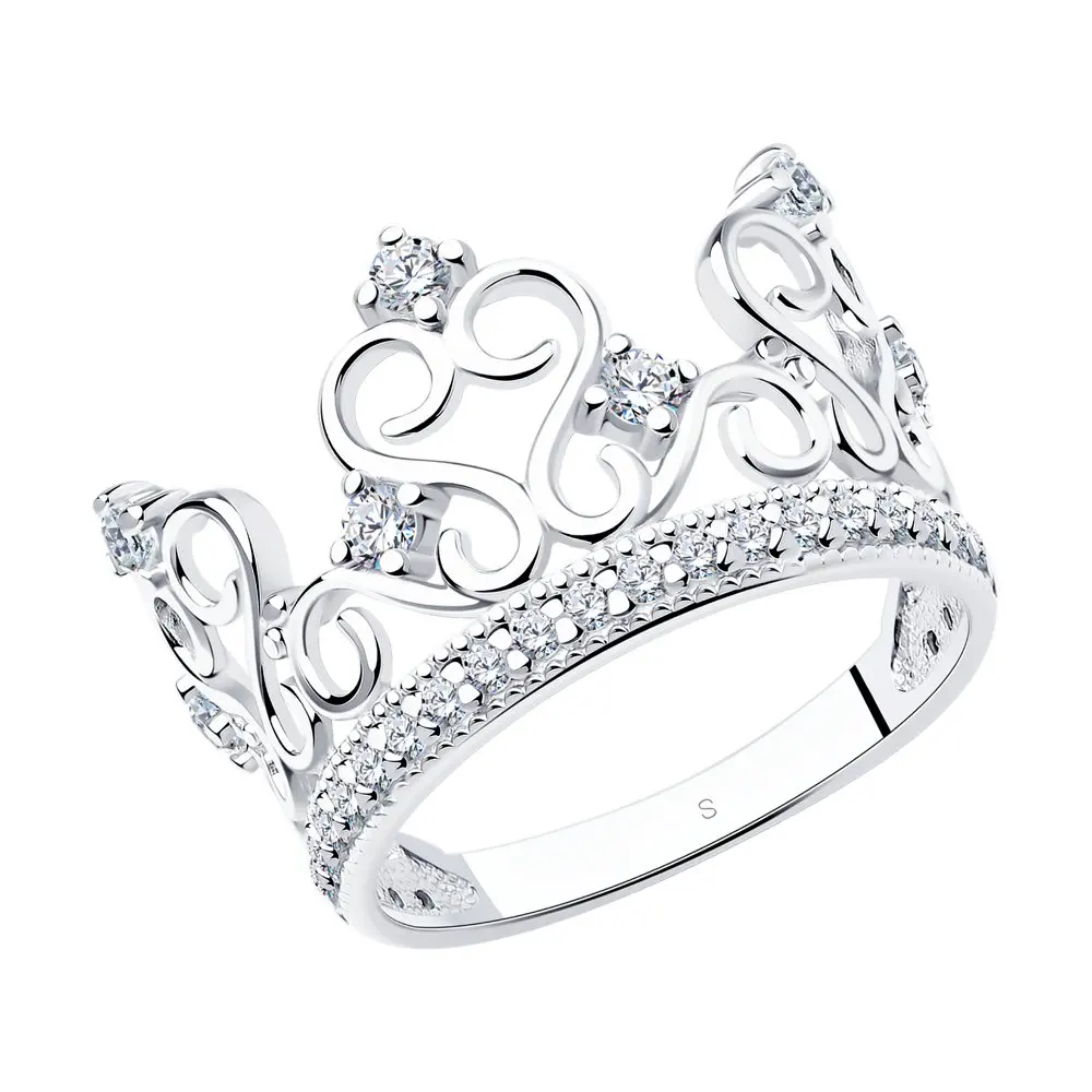 Кольцо в виде короны с фианитами SOKOLOVТеперь драгоценной диадемой могут похвастаться не только представители королевской семьи или победительницы конкурсов красоты. Серебряное кольцо-корона займёт достойное место в вашей шкатулке, а стильный дизайн украшения и блеск фианитов позволят вам выглядеть действительно по-королевски.