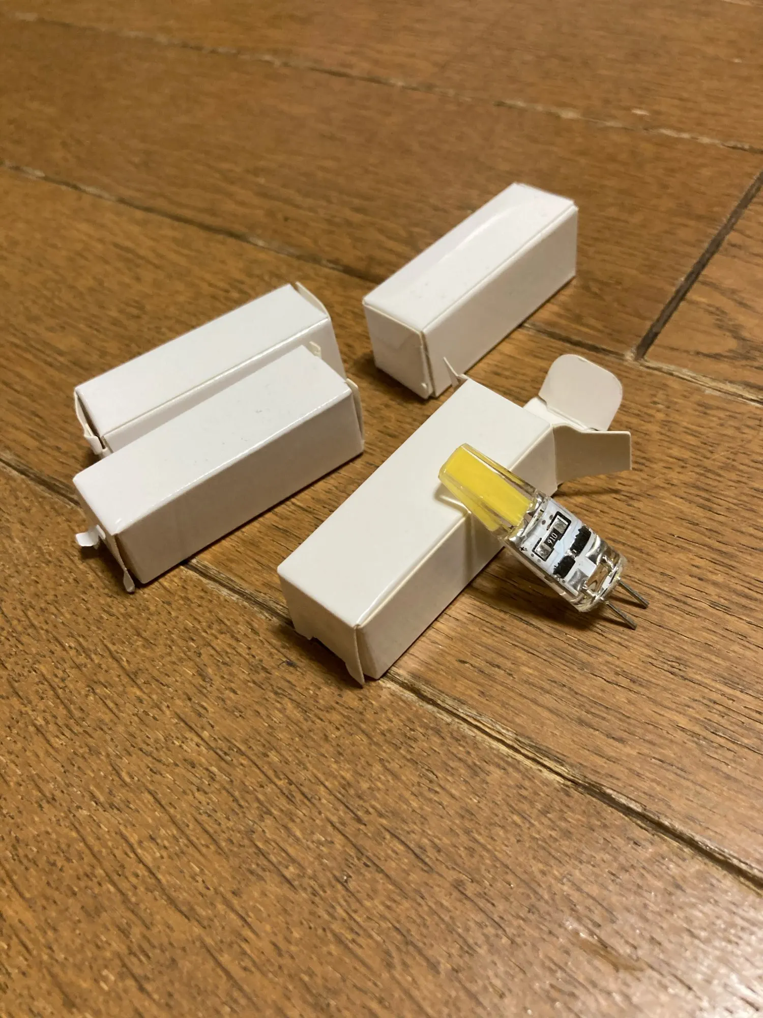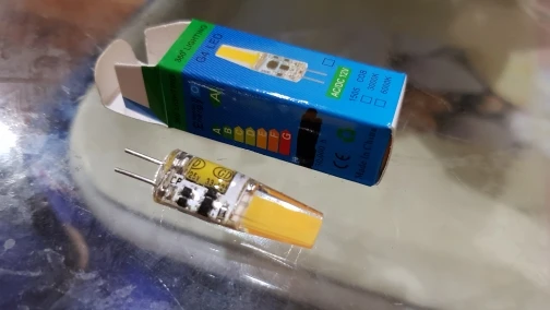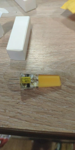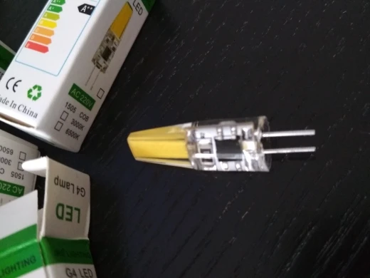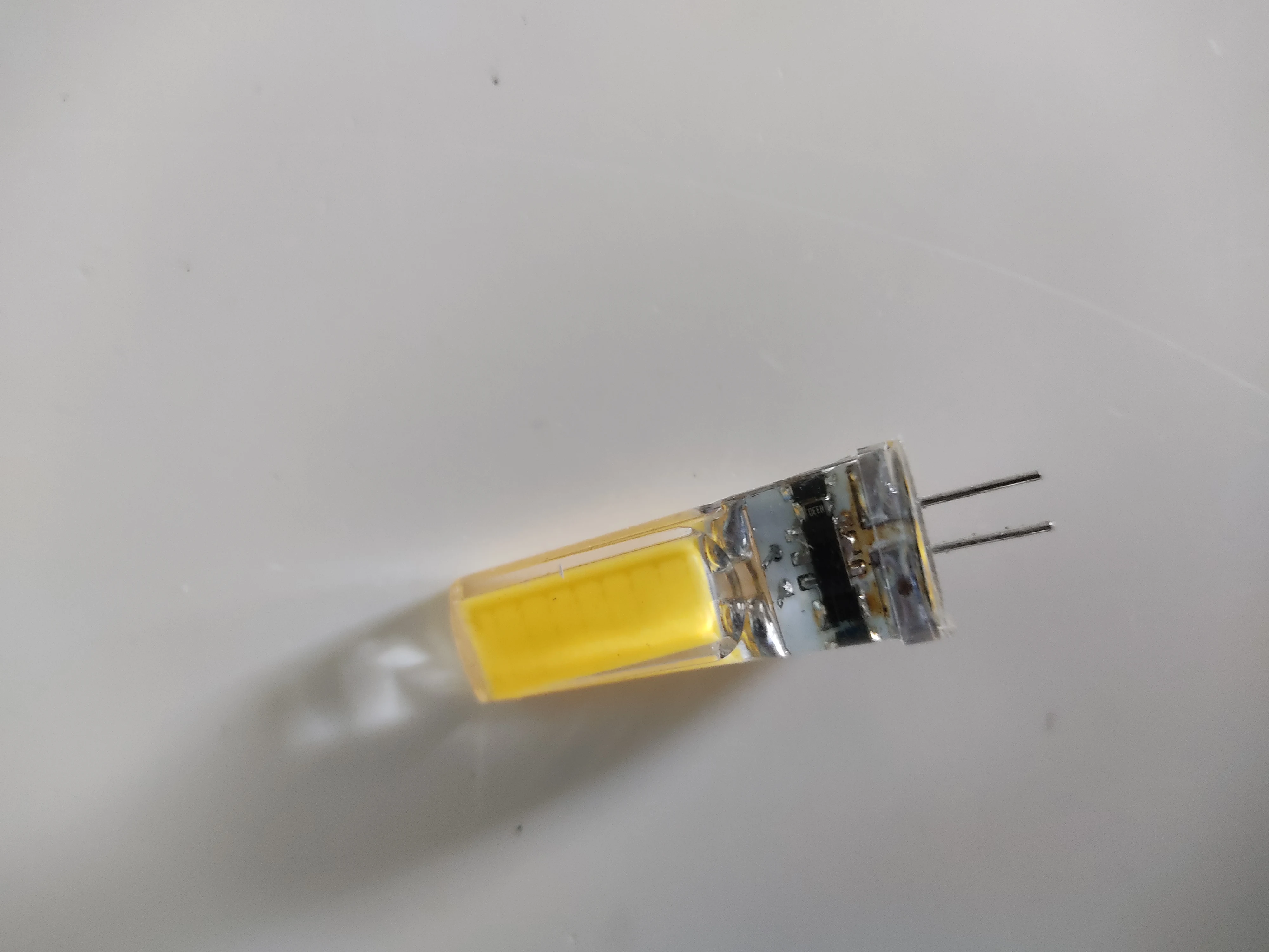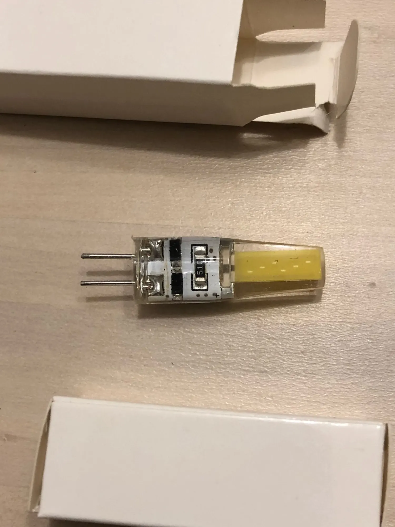 Лампы очень интересные. Современный тип светодиодов (COB) в прозрачной полимерной оболочке (что-то среднее между акрилом и силиконом). Пайка выглядит качественной. Проверить не получилось, так как я ошибся и вместо 12V взял на 220 В. Думал перезаказать, но при верно указанной длине 48 мм в светильник на вытяжке диаметром 50 мм они не влезают. Нужно брать с запасом примерно в сантиметр, буду искать покороче.