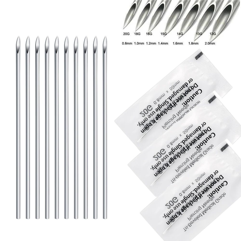 Хирургическая стальная стерилизованная игла для пирсинга тела Одиночная упакованная смешанные размеры20 г = 0,8 мм, 18 г = 1,0 мм, 16 г = 1,2 мм, 14 г = 1,6 мм, 13 г = 1,8 мм, 12 г = 2,0 мм.