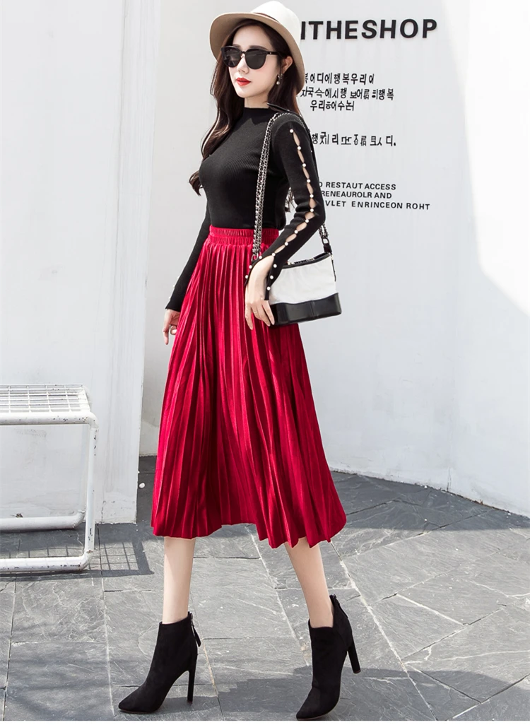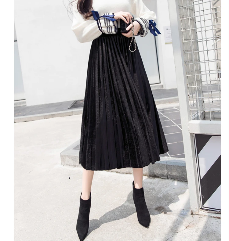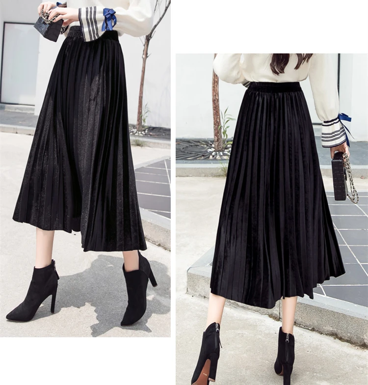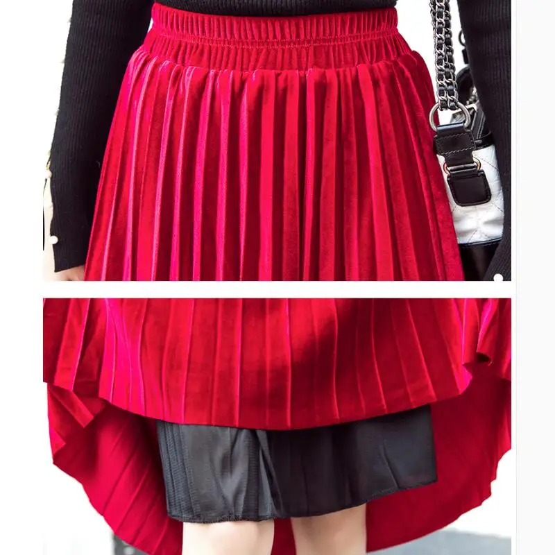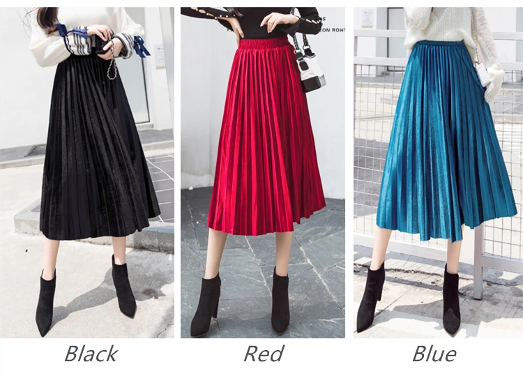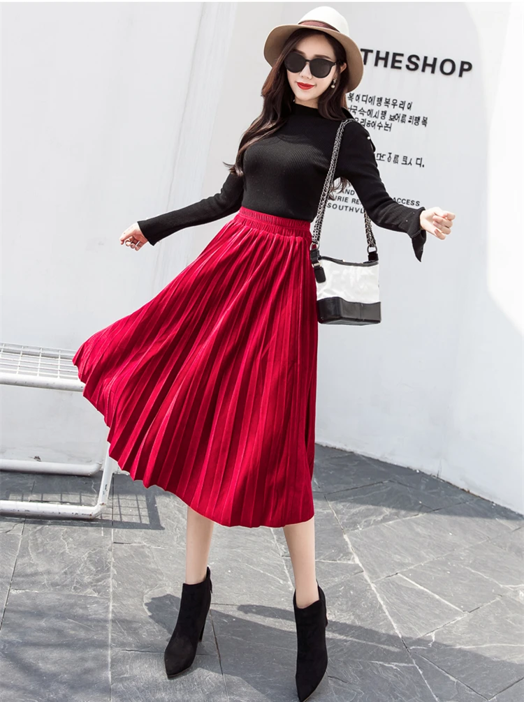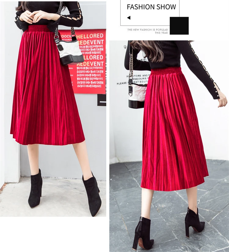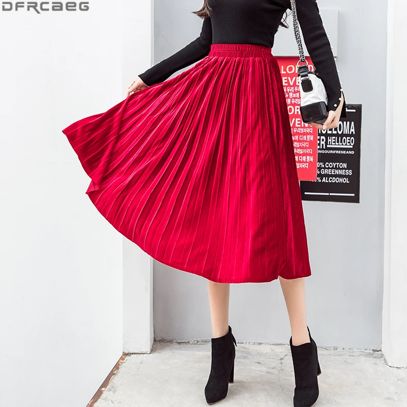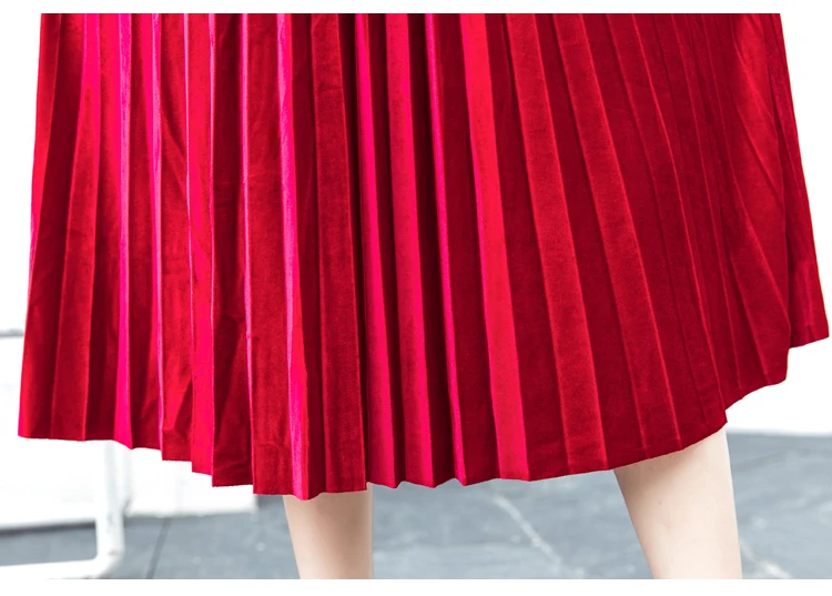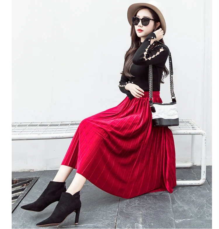 Винтажная эластичная плиссированная юбка макси с высокой талией, зимние Бархатные длинные юбки в стиле ретро для женщин, школьная юбка для женщин, красная, Черная