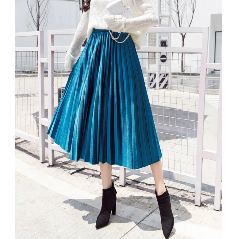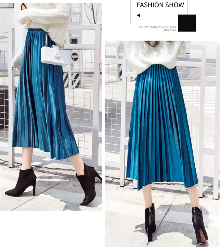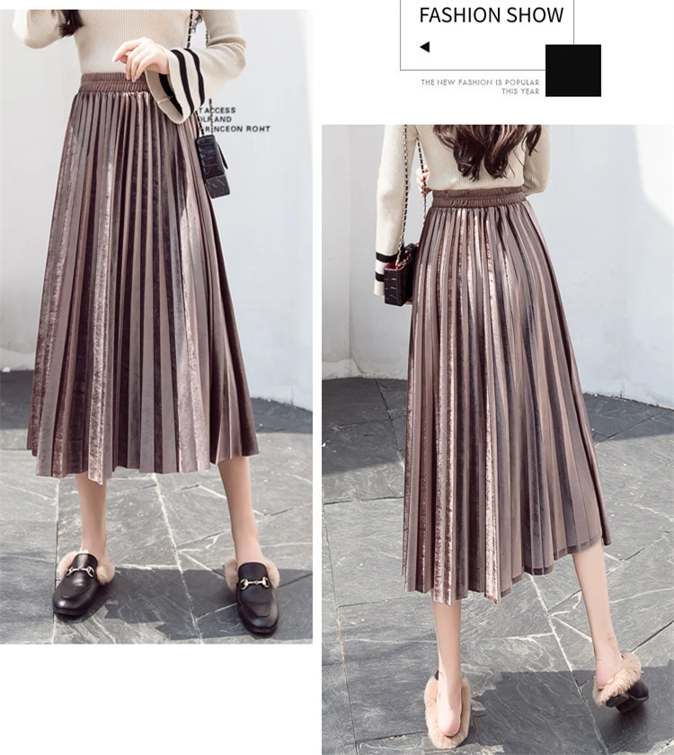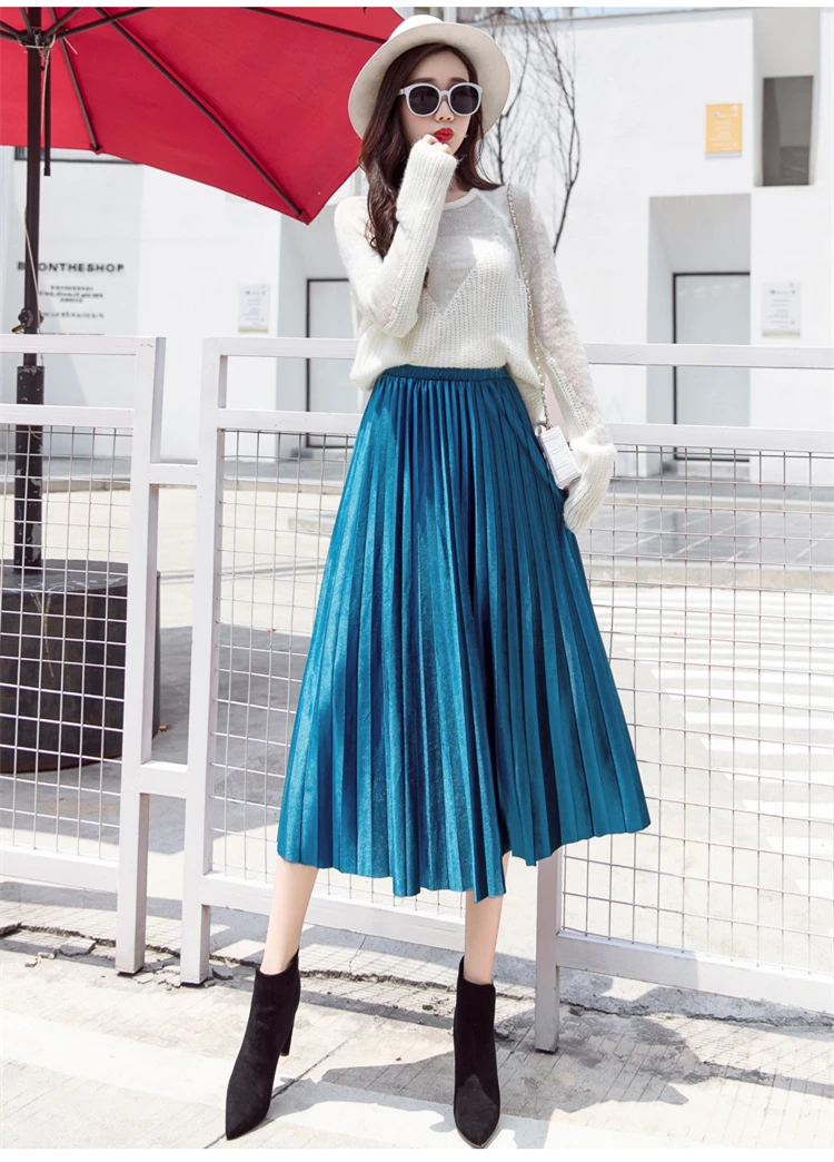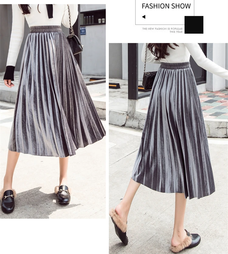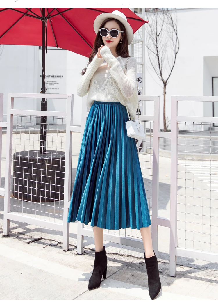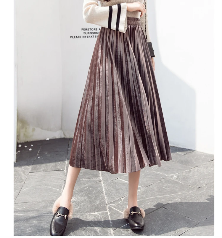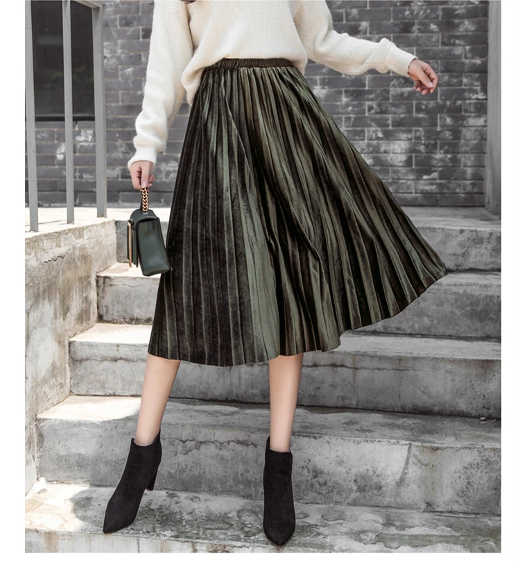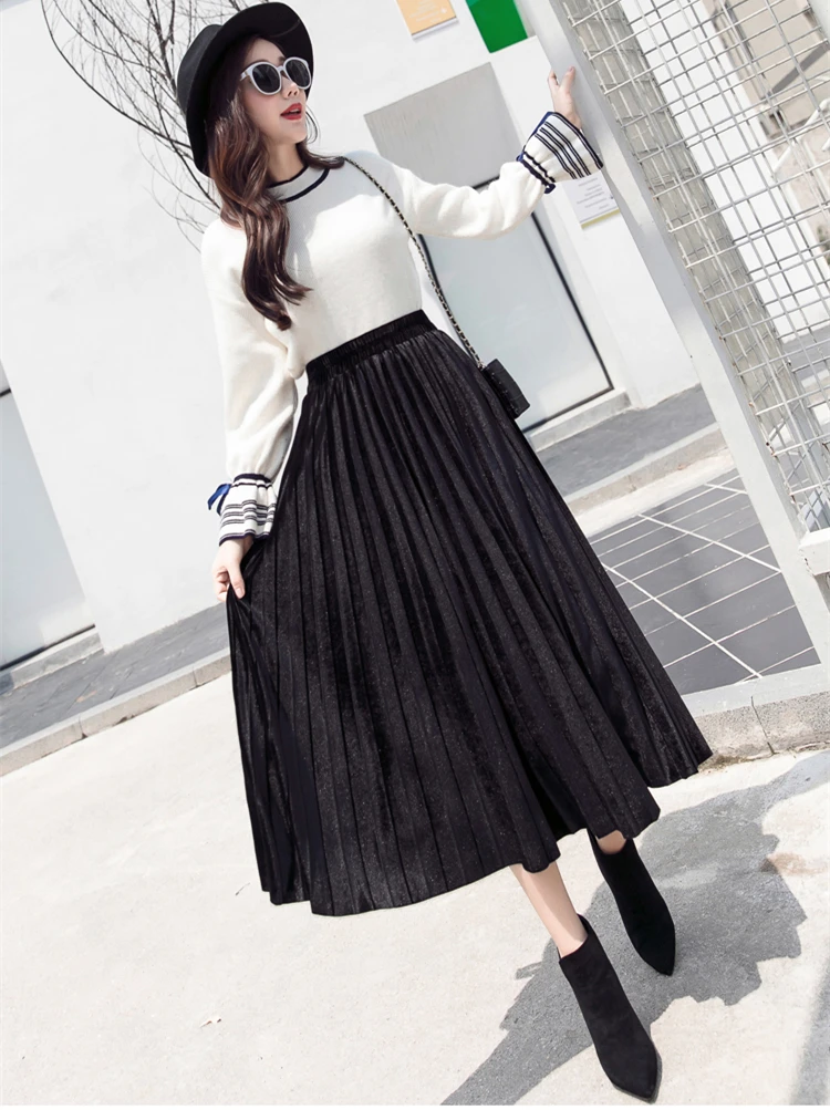 Винтажная эластичная плиссированная юбка макси с высокой талией, зимние Бархатные длинные юбки в стиле ретро для женщин, школьная юбка для женщин, красная, Черная