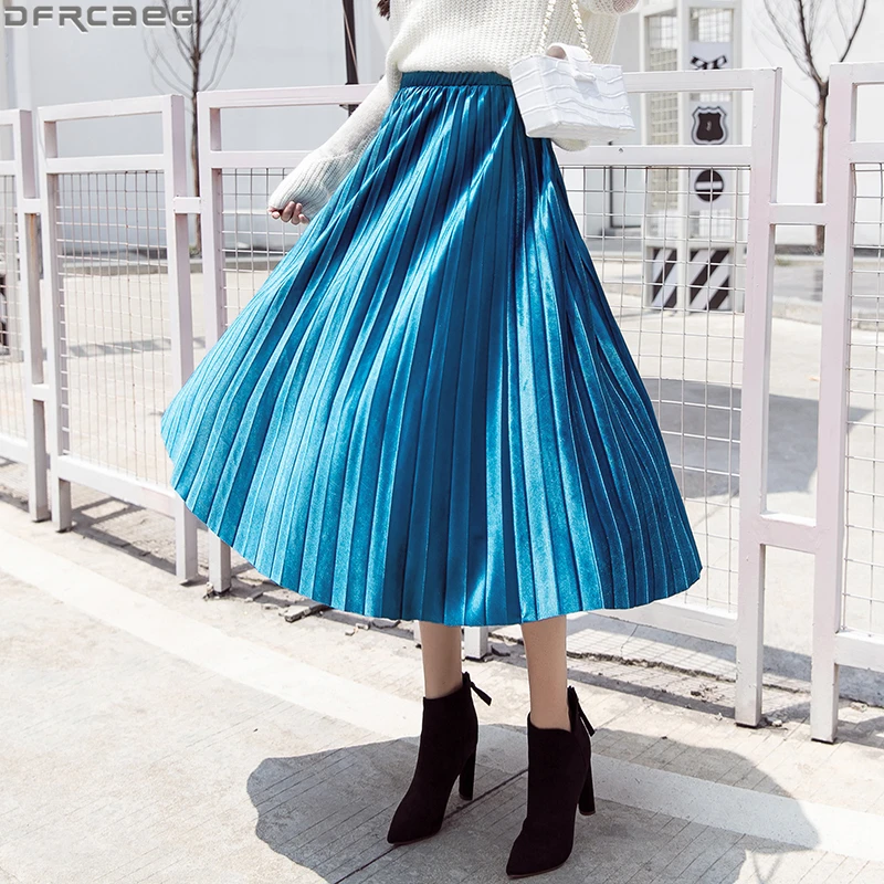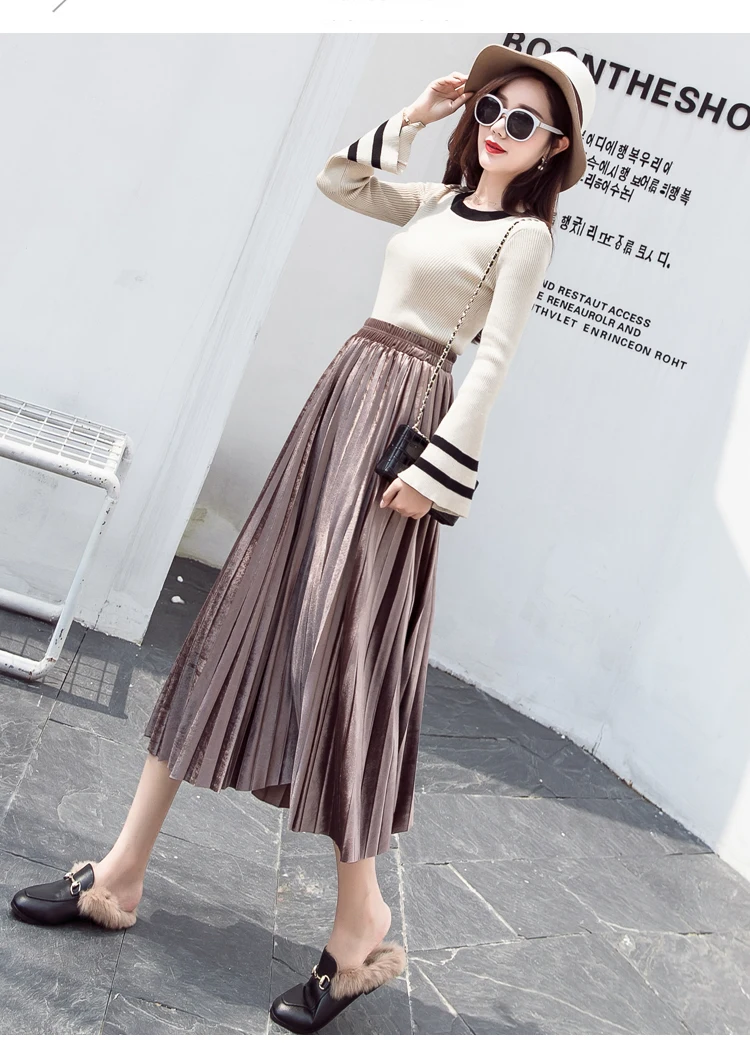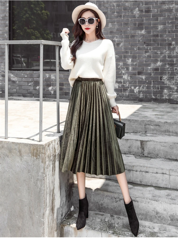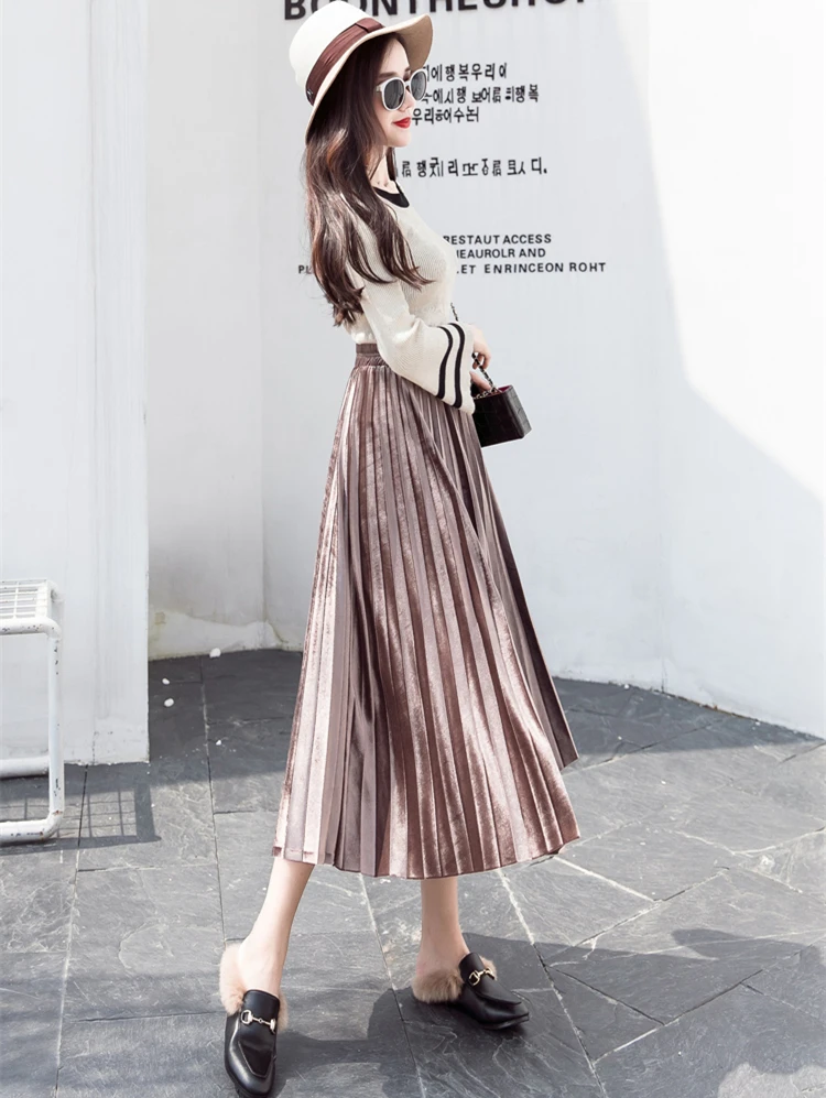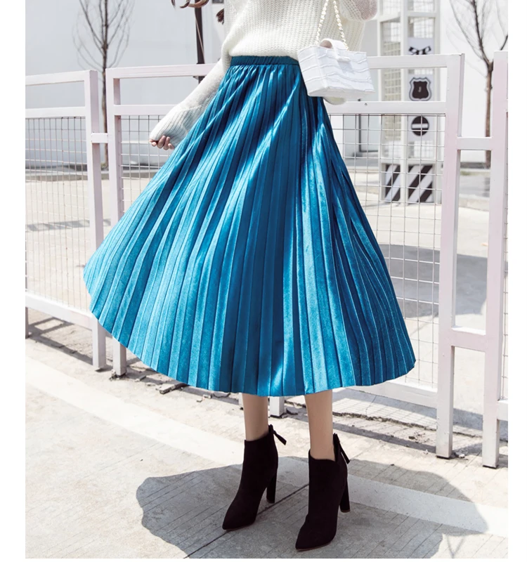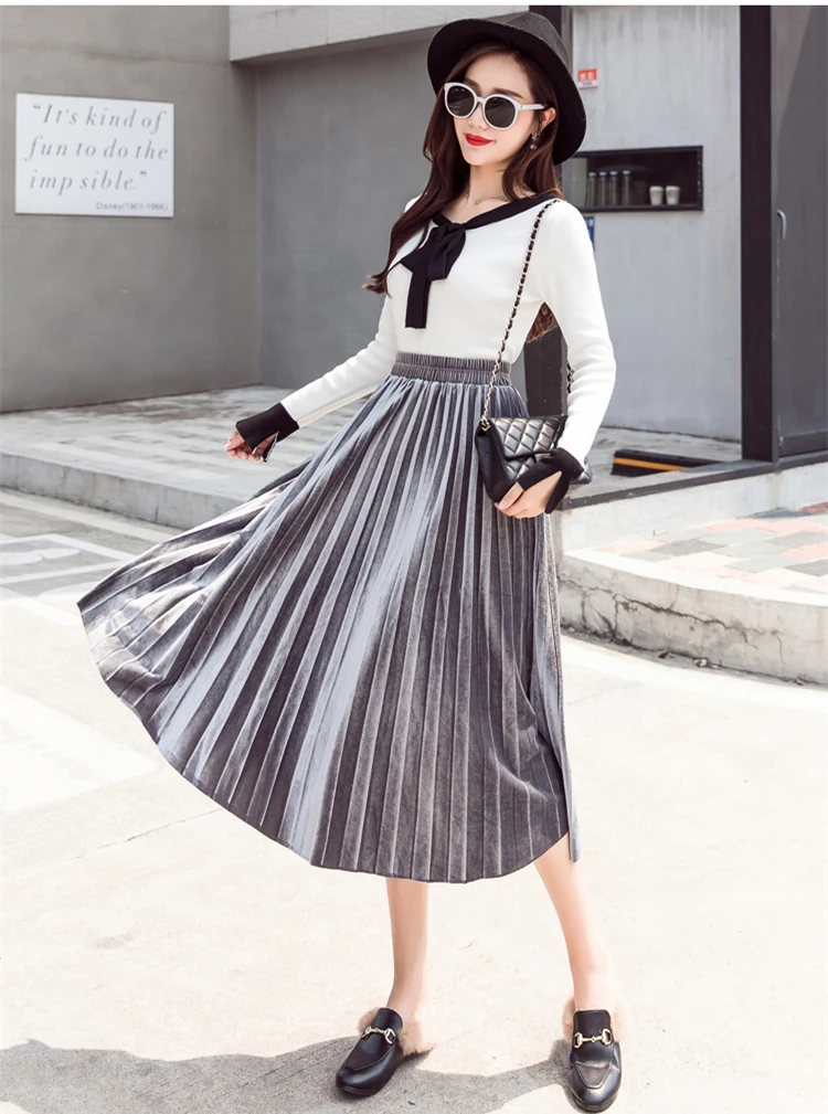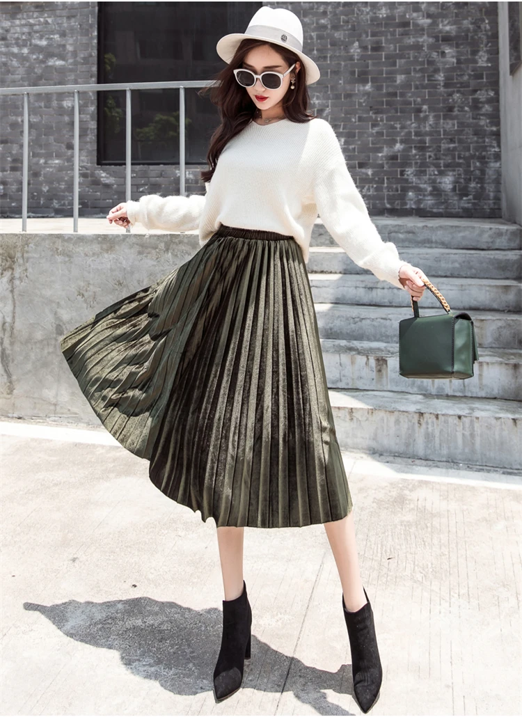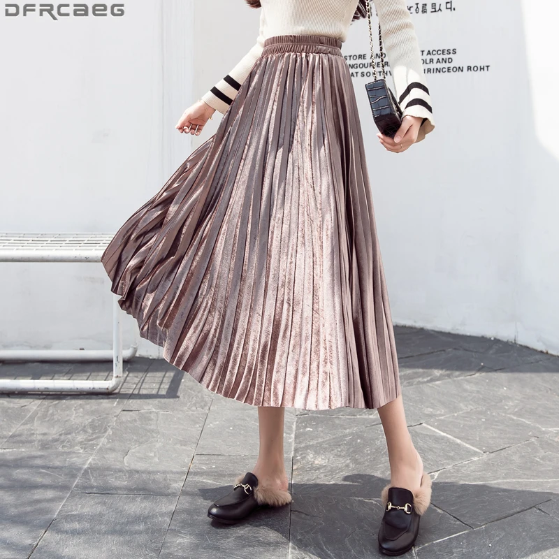 Винтажная эластичная плиссированная юбка макси с высокой талией, зимние Бархатные длинные юбки в стиле ретро для женщин, школьная юбка для женщин, красная, Черная