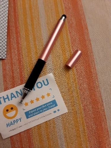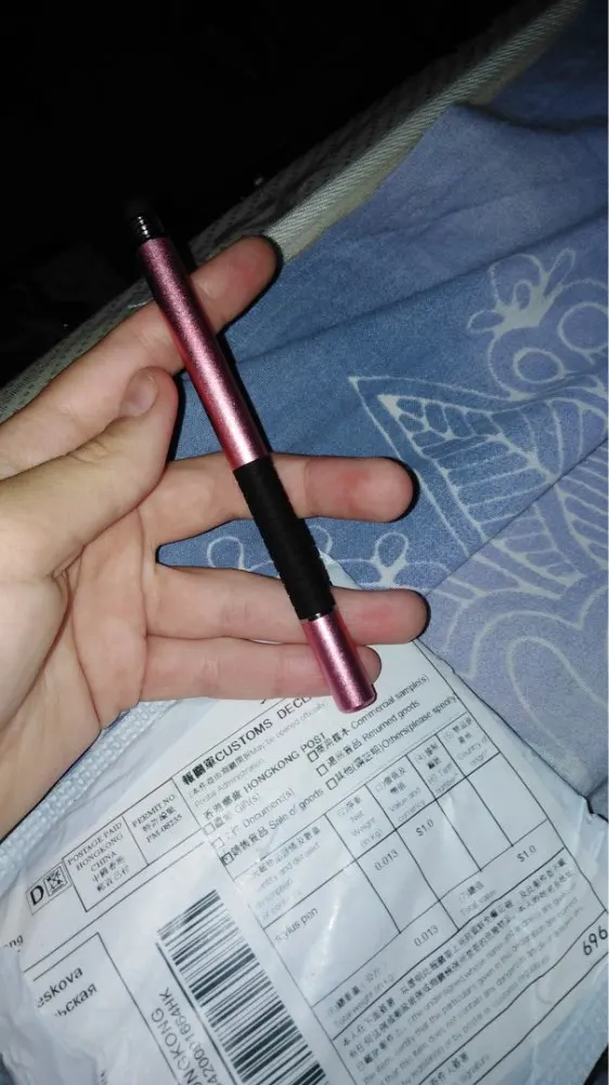 Стилус просто потрясающий.Легкий,красивый и стильный дизайн.Обе стороны превосходно работают даже при слабом нажиме на сенсор.На айфоне работает шикарно,тонкой стороной с круглой пластиной можно легко сделать роспись в документе.Товар супер.Пришёл очень быстро за 15 дней до Санкт-Петербурга.Рекомендую.
