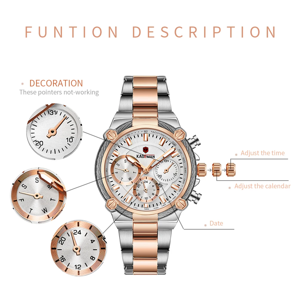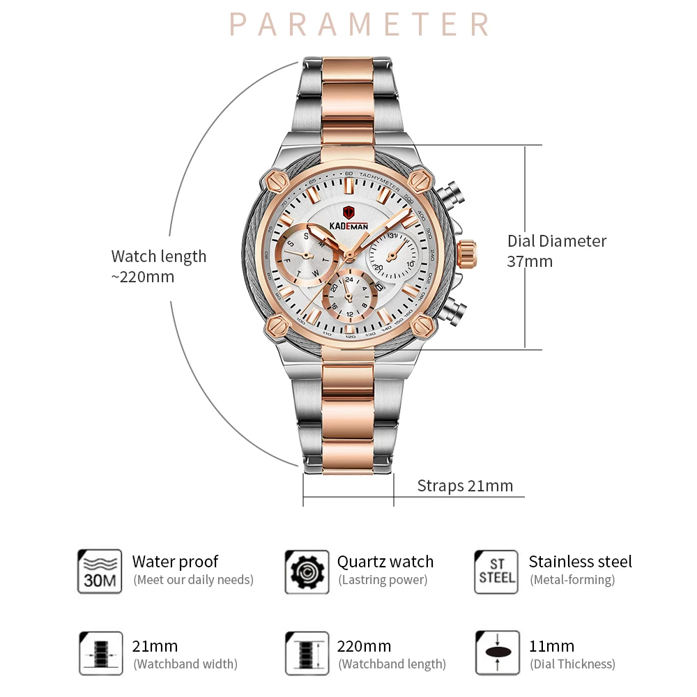 Бренд: KADEMAN Серия: 836 Часовой механизм: кварцевый механизм Дизайн: уникальные циферблаты; Специальные украшения Стиль: класса люкс; Модные; Праздничное платье; Бизнес Основные функции -100%; Оригинальная брендовая одежда наивысшего качества -3ATM/возможностью погружения на глубину до 30 м Водонепроницаемость -Качественный корпус из нержавеющей стали