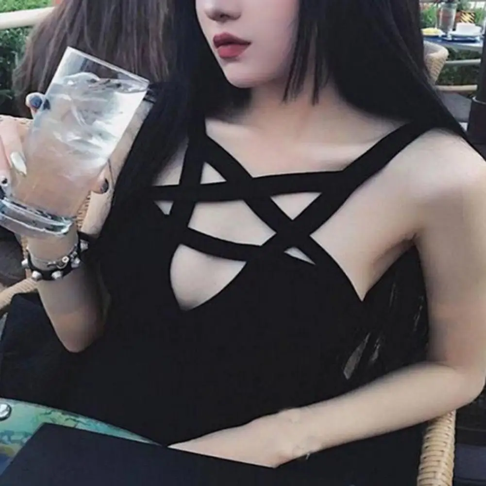 Женский комбидресс с открытой спиной, готический комбидресс с вырезами и пентаграммой, однотонный комбидресс без рукавов, идеально подходит для сочетания с вашими брюками