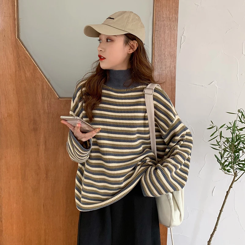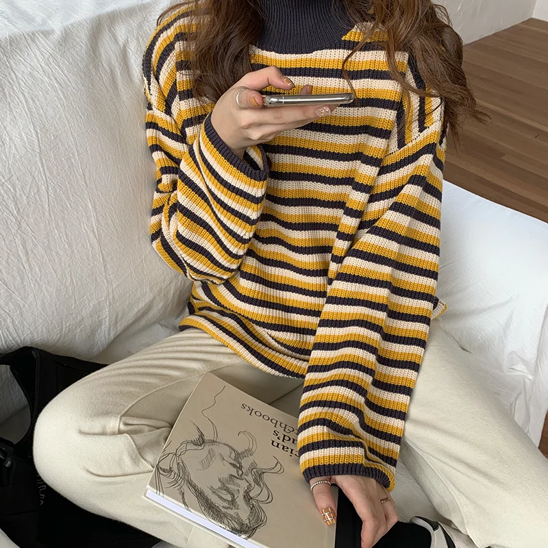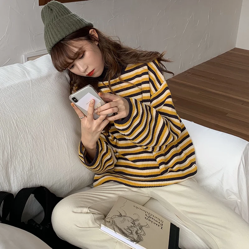 Женские свитера в японском стиле Kawaii Ulzzang, полосатый свободный свитер с длинным рукавом, женская одежда в Корейском стиле Харадзюку для женщин