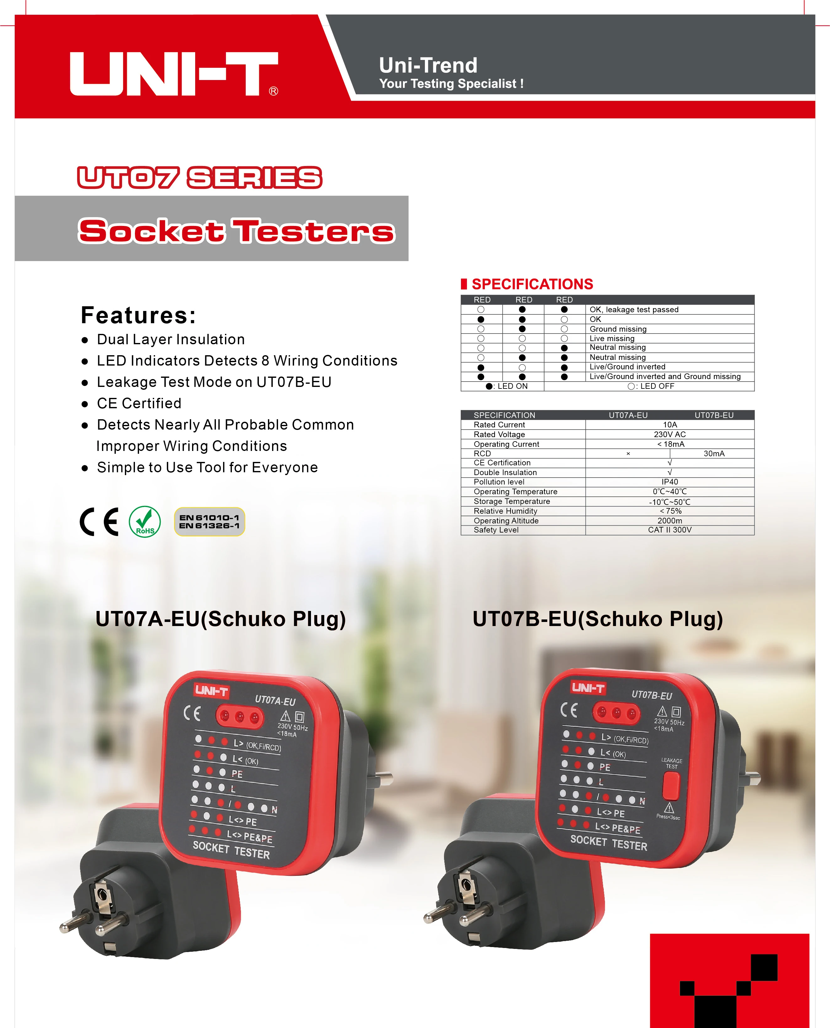 Тестер для розеток UT07 UNI-T, детектор с европейской вилкой, нейтральная заземление, огнеупорная фаза, проверка полярности, обнаружение проводки, RCD тест на утечку