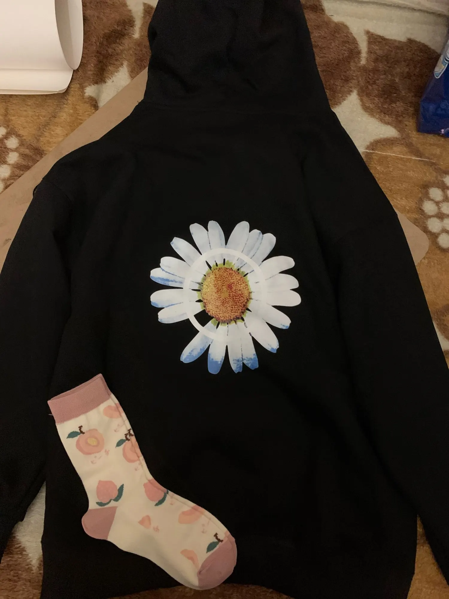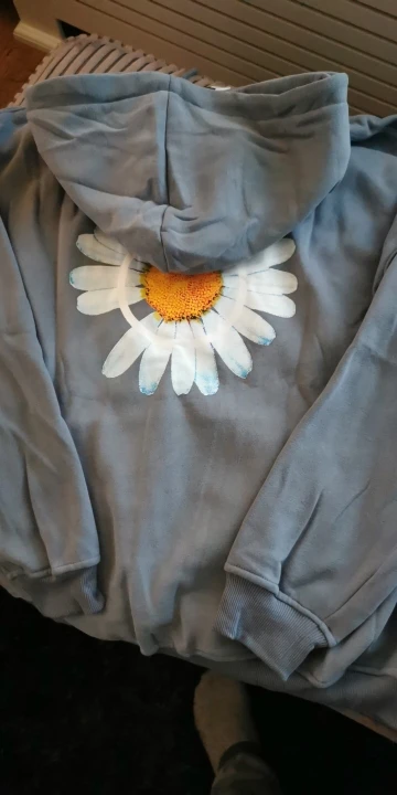 Обалденная толстовка, качество - мега крутое. Материал очень похож на качественный флис, скорее всего, что так и есть. Очень долго и упорно искала именно с ромашкой - наша, поэтому счастью нет предела!