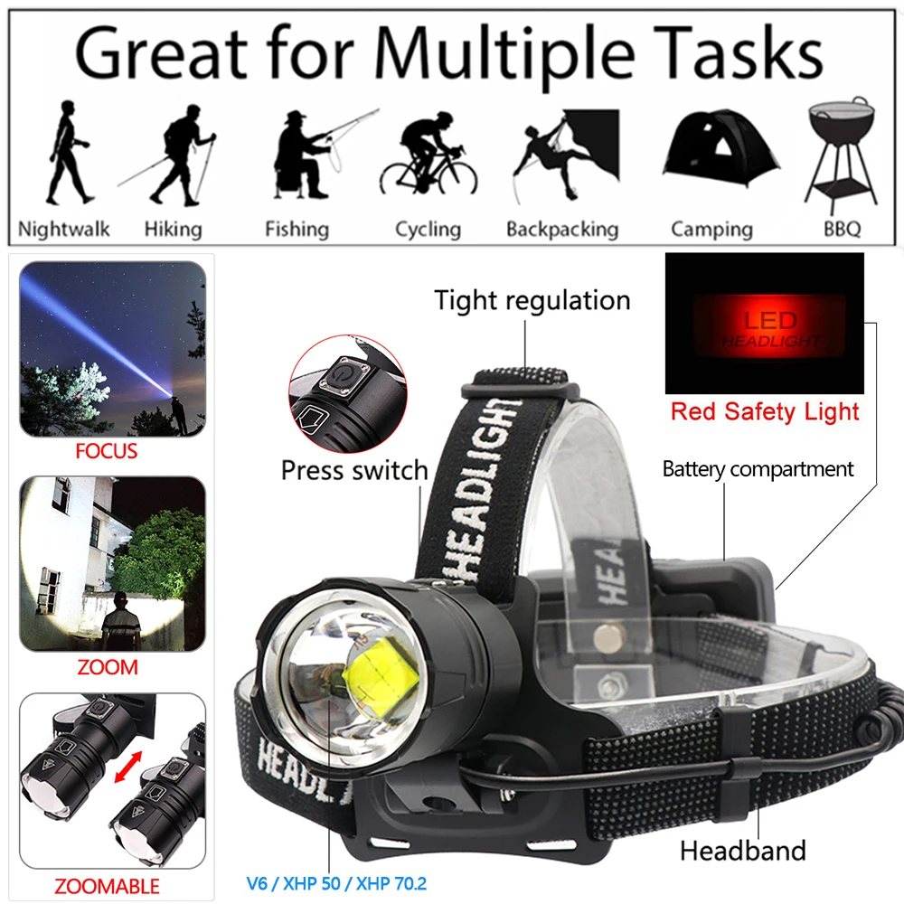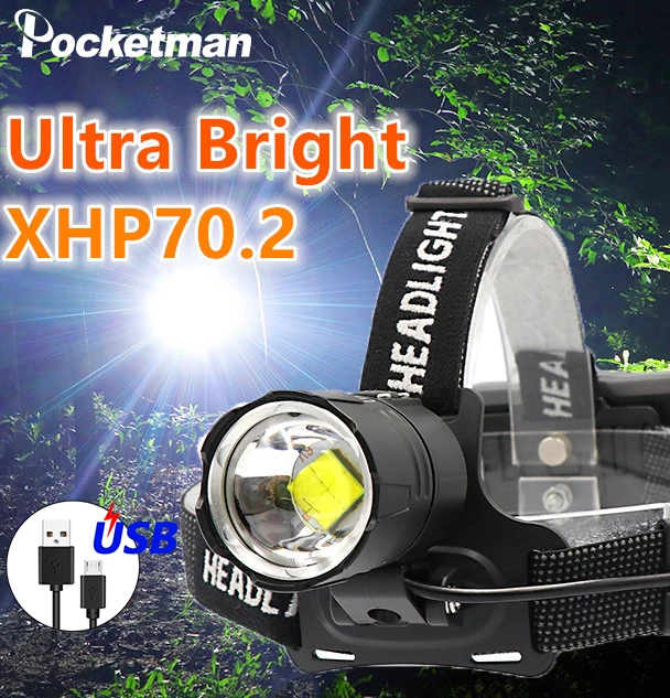 Светодиодный налобный фонарь XHP-70.2 XHP50, налобный фонарь для рыбалки и кемпинга, мощный фонарь, налобный фонарь с зумом, USB фонарь 18650