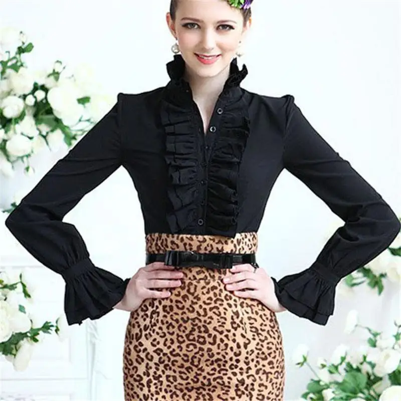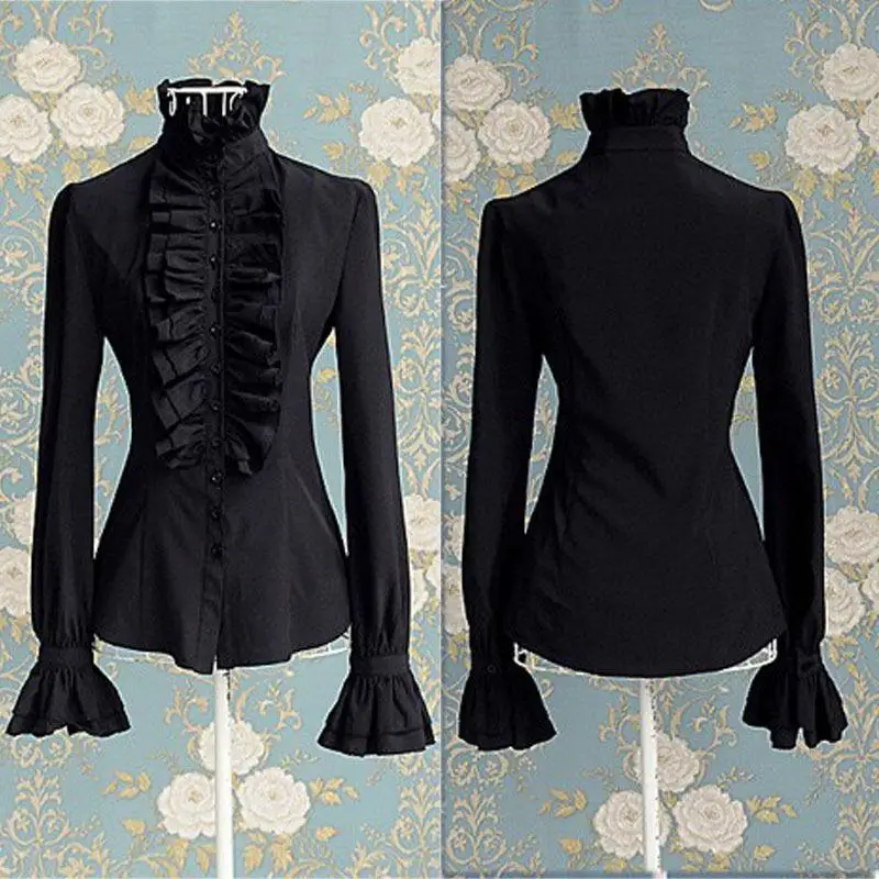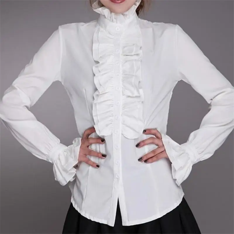 Модная блузы в викторианском стиле Женская Офисная белая рубашка с высоким воротником, оборками и манжетами